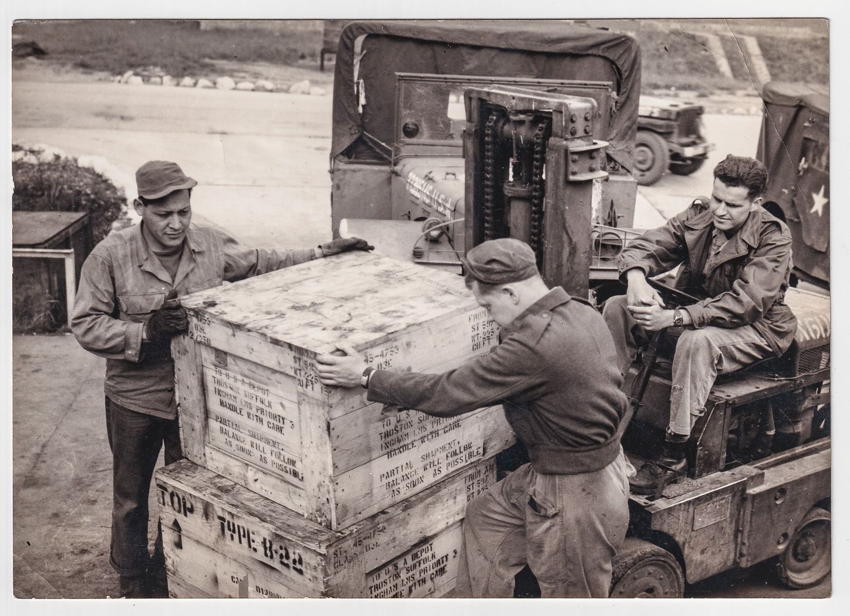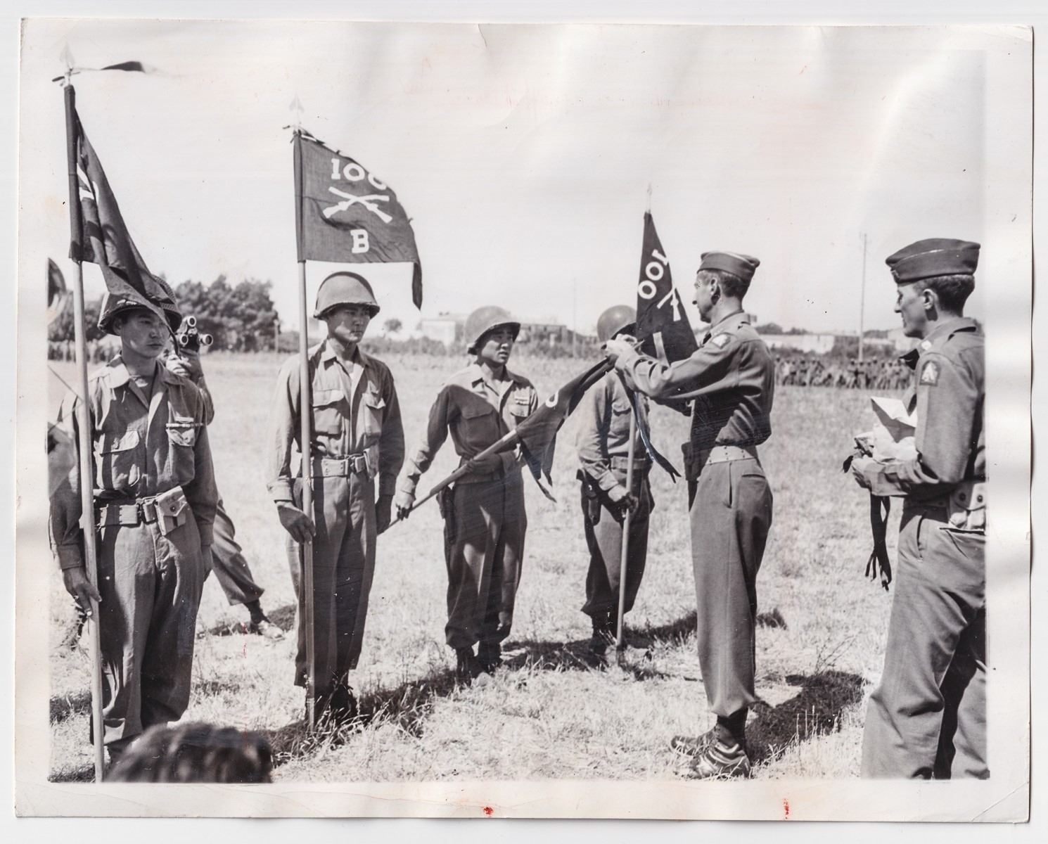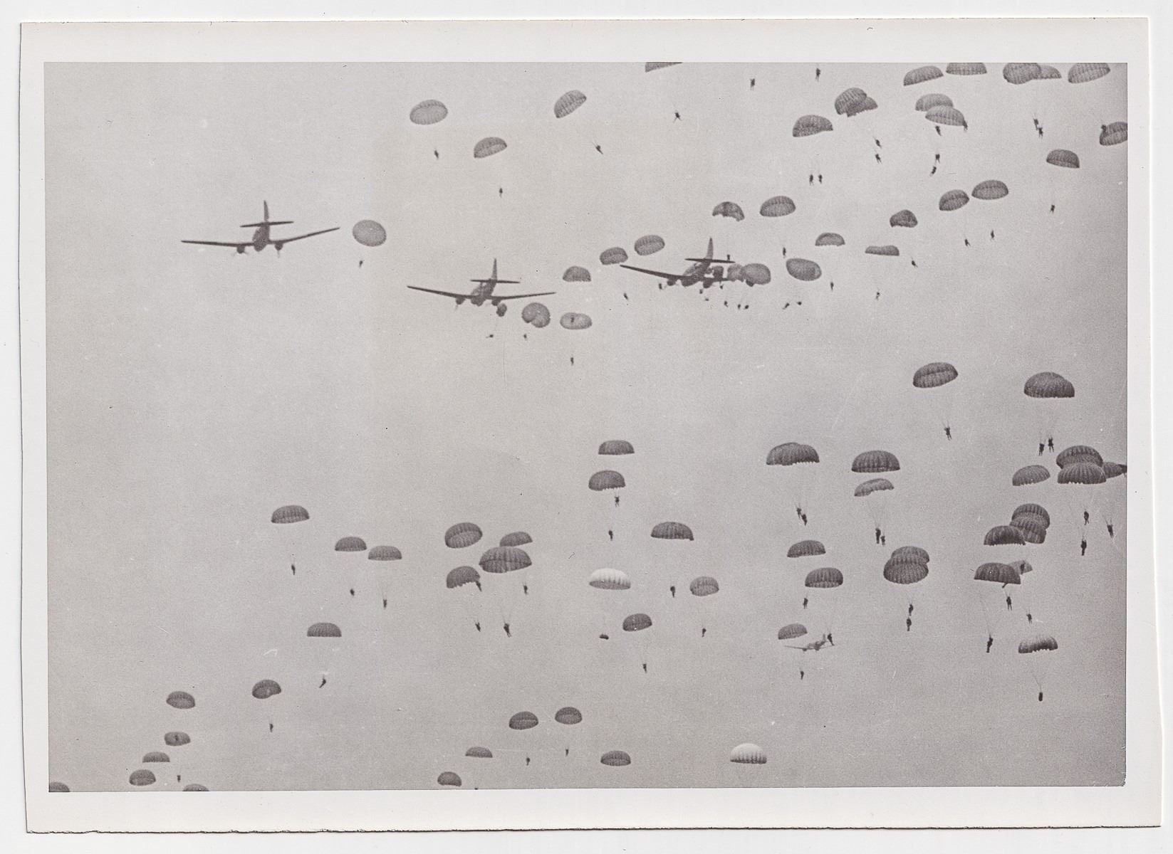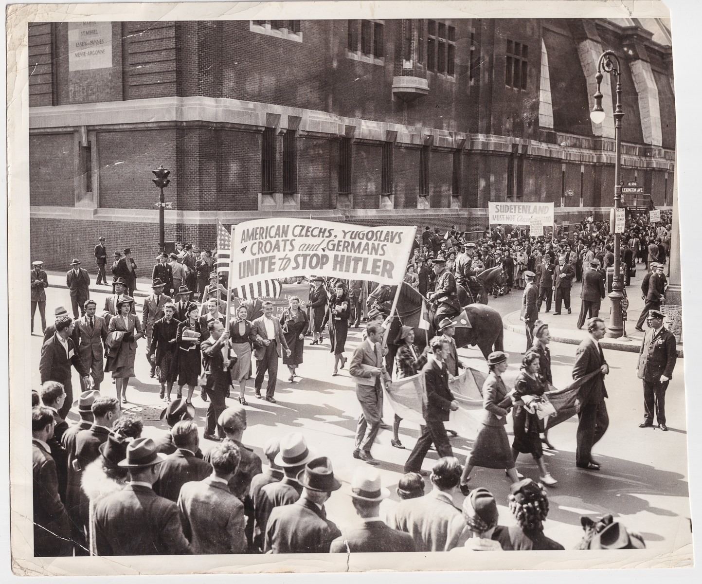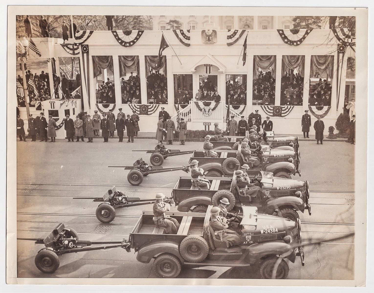 Group of ten WWII press photographs, includes New York City protests against the Nazi invasion of Czechoslovakia, President Franklin D. Roosevelt overlooking a parade, a Japanese-American unit receiving a citation, planes, and paratroopers. Approx. 8 x 10 inches.
