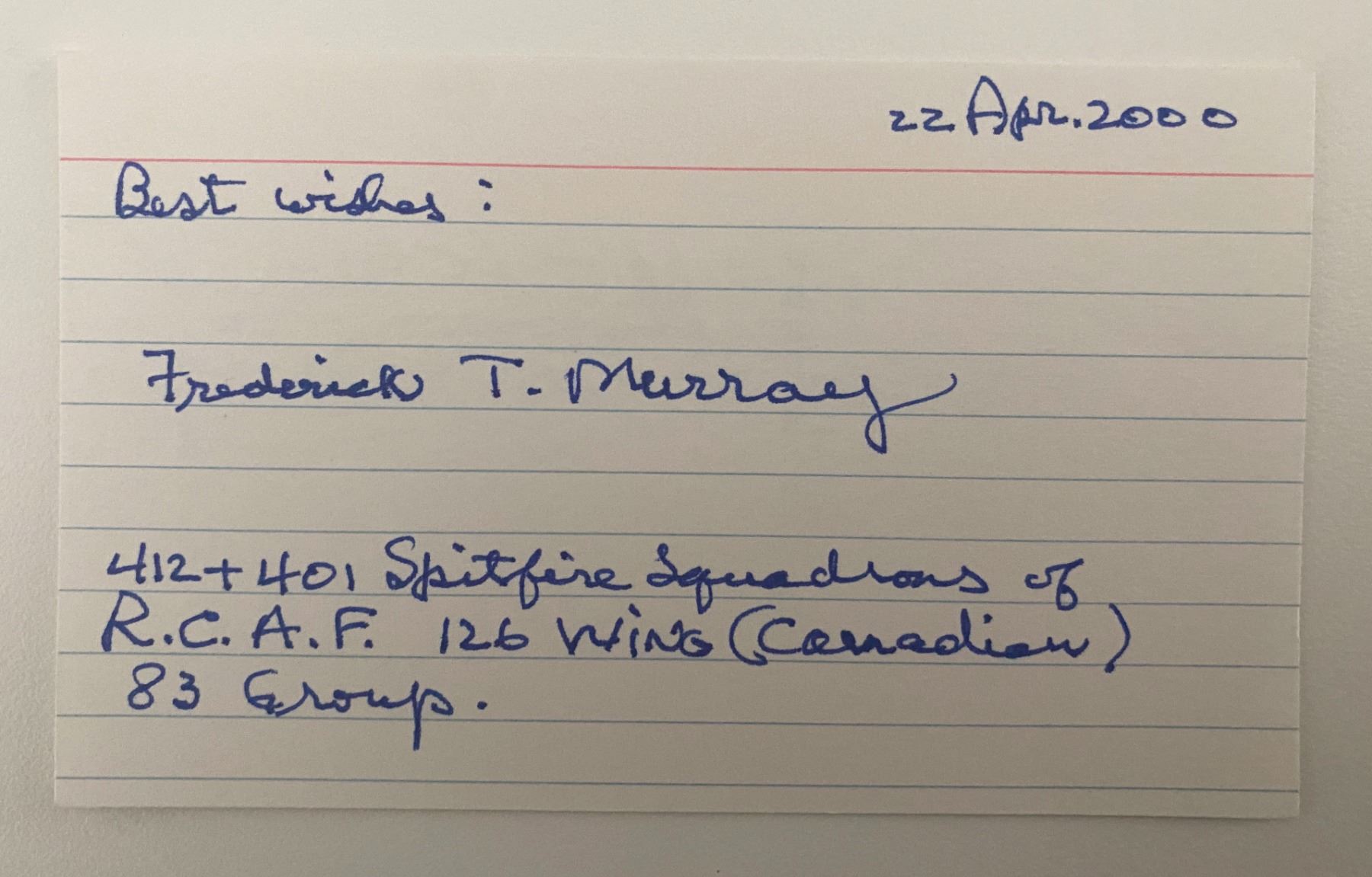 WWII RCAF Flying Ace Frederick T. Murray Signed Note. 3x5inches