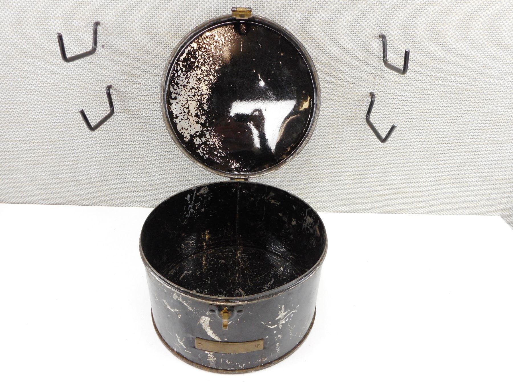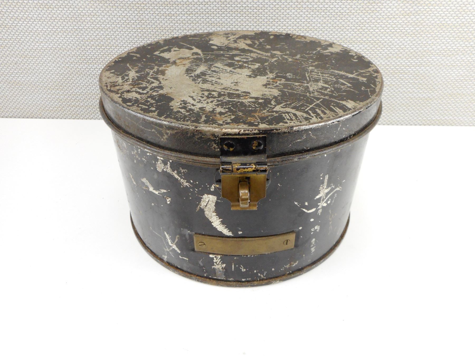 WWII RCN HAT BOX FPR STPRAGE OF SPARE CAPS EITHER WHITE TOP OR BLACK PUSSER TYPES, METAL ROUND TIN , ROUND METAL TIN, WITH 'ENGRAVING' PLATE, APPROX. SIZE, 10.5" WIDE, X 7" HIGH