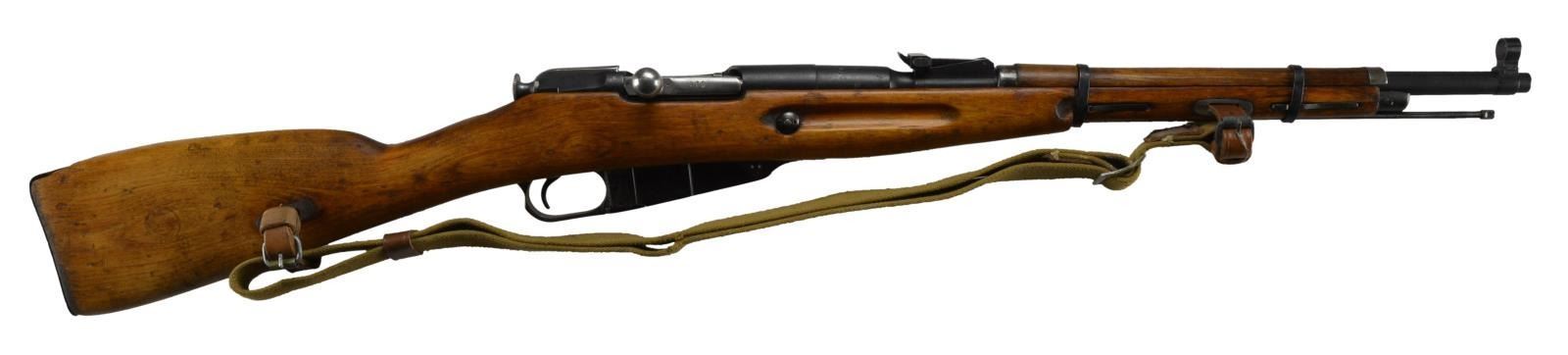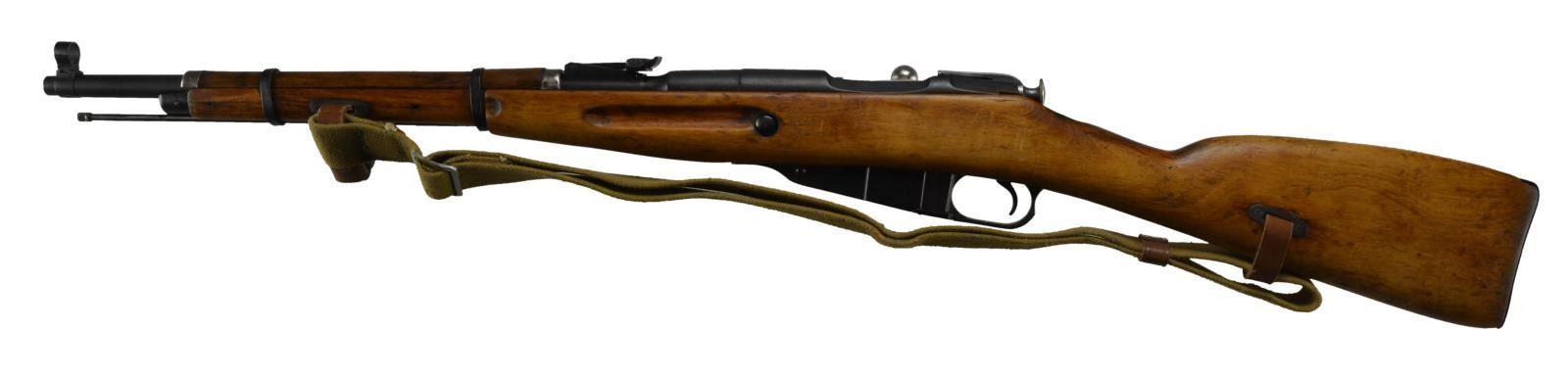 Cal. 7.62x54R. S# 38-1148. Bbl. 20 1/8". Import marked on left side of rnd. receiver. Bbl. is marked over chamber w/ Izhevsk Arsenal, hammer & sickle in wreath & arrow in triangle dated 1940. Tangent rear sight graduated to 1,000 meters. Post front sight w/ protective hood. Cleaning rod is present. Bbl. bands retained by springs. Hardwood stock set. Russian green web sling. CONDITION: arsenal rework stock set has moderate wear & scattered handling marks throughout. Metal retains 85% arsenal rework finish w/ scratches & handling marks. Good shiny bore. PROVENANCE: from the estate collections of Charles P. Obremski. (22-1325/RW). CURIO. $100-200.