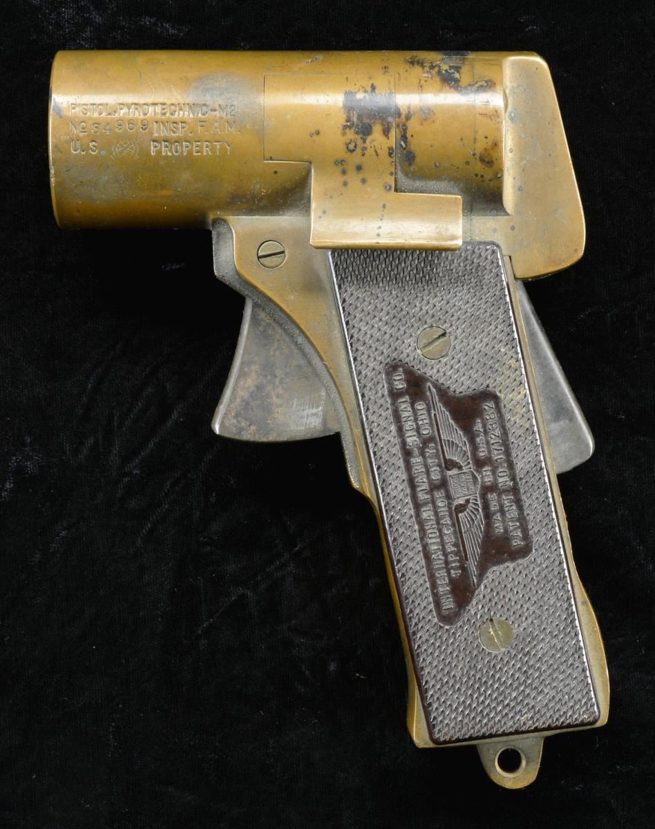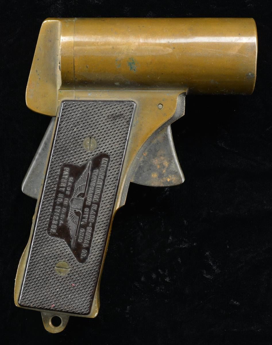 M2 FLARE PISTOL. Cal. 37mm. S# 34969. Bbl. 2 1/4" smoothbore. Brass construction. Grip safety. 2 Piece brown bakelite grips. CONDITION: good overall w/ mustard patina on brass w/ areas of staining & light marks. Very good grips. Good bore. (02-16609/MD). $200-300.