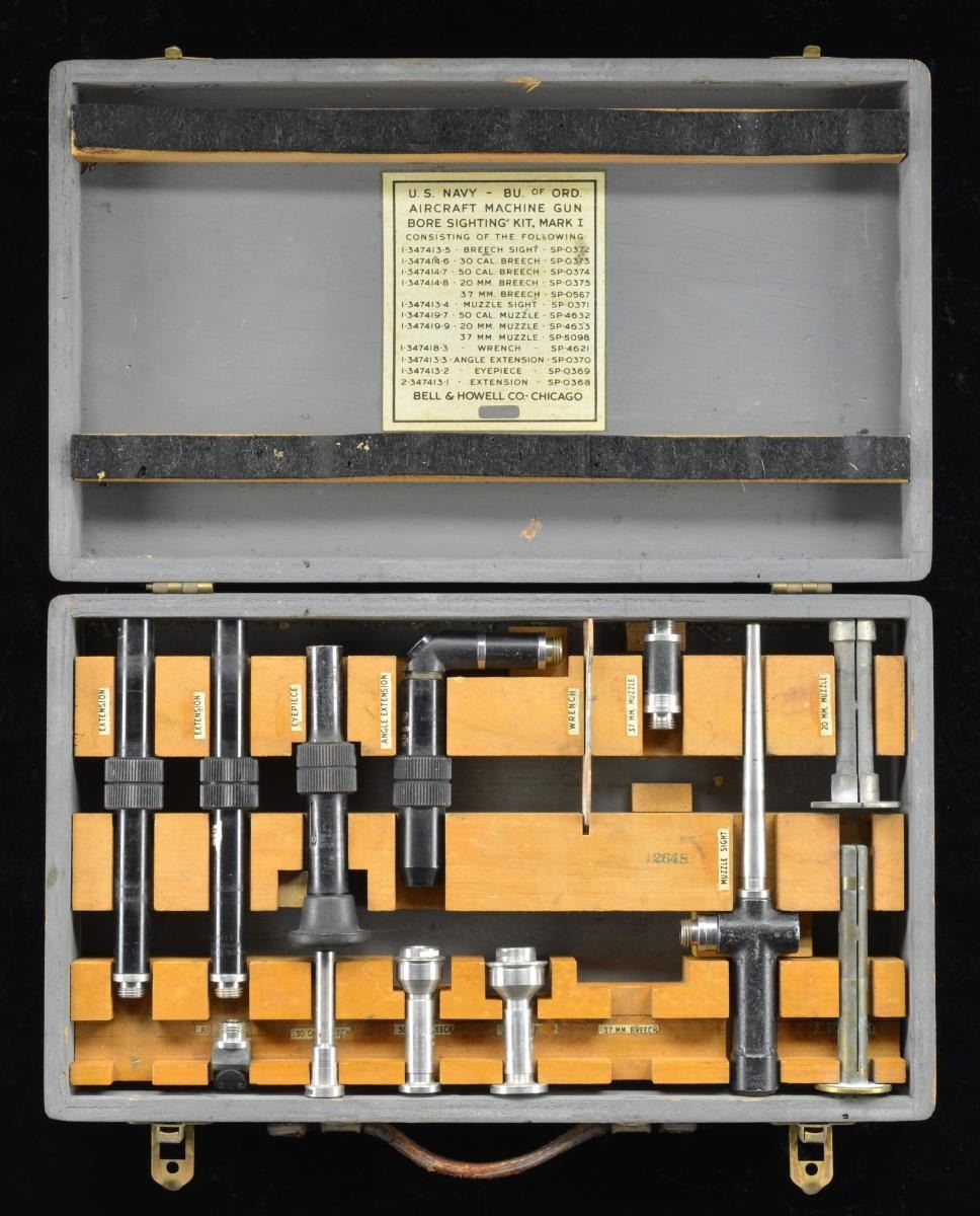 BORE SIGHTING KIT, MARK I BY BELL& HOWELL. This kit 15" x9" x2" gray painted box w/ 2 latches & carrying strap. Box contains kit & 14 piece compartmentalized interior. CONDITION: appears mostly complete kit except for 37mm breech. Box exterior in fair condition w/ flaking finish , chips & moderate handling marks. PROVENANCE: from the Estate Collections of Charles P. Obremski. (02-16332-4/MD). $150-250.