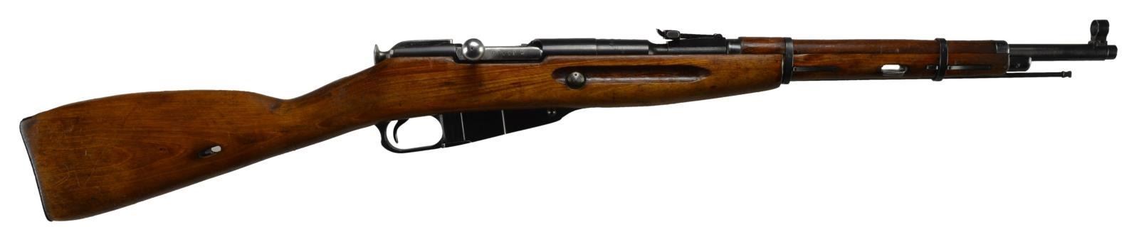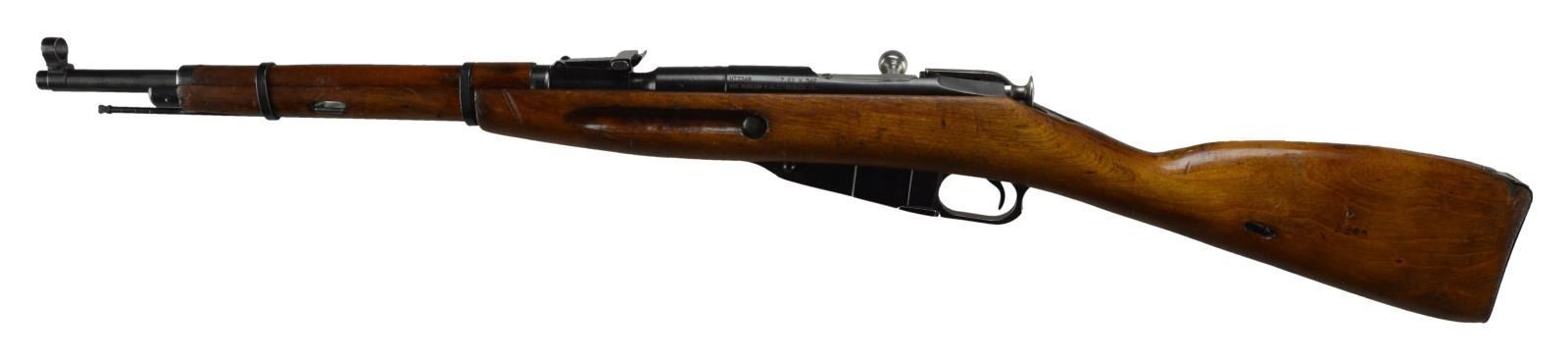 Cal. 7.62x54R. S# HT3340. Approx. 2,000,000 mfg. 1939-1943. Matching numbers on 20" bbl., mag. plate, bolt, buttplate & buttstock; numbers appear to have been made to match. Protected post front sight & 1,000m rear sight. Rnd. receiver w/ CAI import marks, bbl. dated 1943 w/ Izhevsk arsenal stamp. Hardwood stock set w/ sling collar slots & cleaning rod. CONDITION: very good overall as refinished. Stock exhibits sm. & lg. cracks. Very good bore. PROVENANCE: from the estate collections of Charles P. Obremski. (22-1329/MD). CURIO. $200-300.