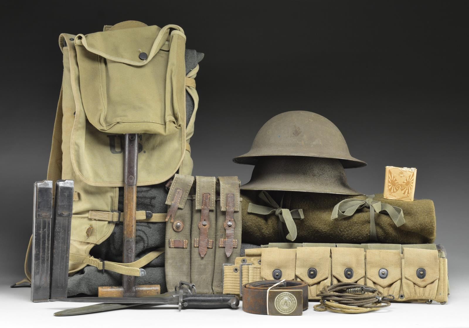 US: WWI 1918 dated Haversac w/ "USMC" marked OD green woll blanket & WWII Ames shovel & protective cover for spade. / 2 WWI era US Doughboy helmets. / WWII US blanket roll. / Tan khaki US ammo belt. / OD Green ammo belt. / 1942 AFH M1 Garand bayonet w/ M7 scabbard. / 2 US lanyard cords. / Gray wool blanket. / MISC: WWI Prussian 1916 Kochebenning belt w/ "Gott Mit Uns" & crown bucle. / 1942 German MP38/40 three mag. pouch w/ 2 mags. included. / Opened packet of Japanese issued 20 cigarettes. / CONDITION: items appear in good condition w/ staining, wear & oxidation on metal parts. (02-16853/MD). $300-500.