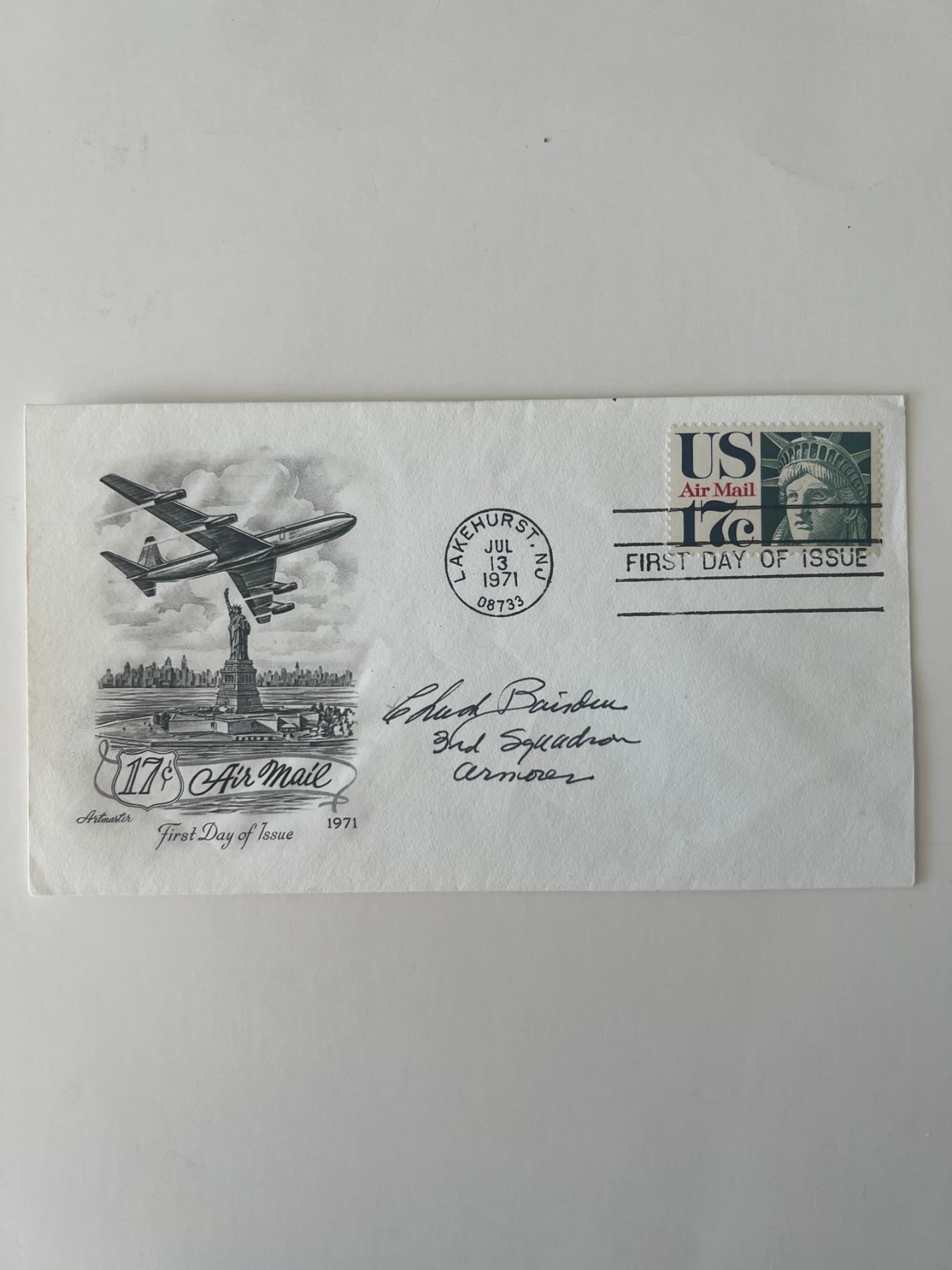 WWII pilot signed cover. Lakehurst, New Jersey. July 13, 1971. 6x4inches
