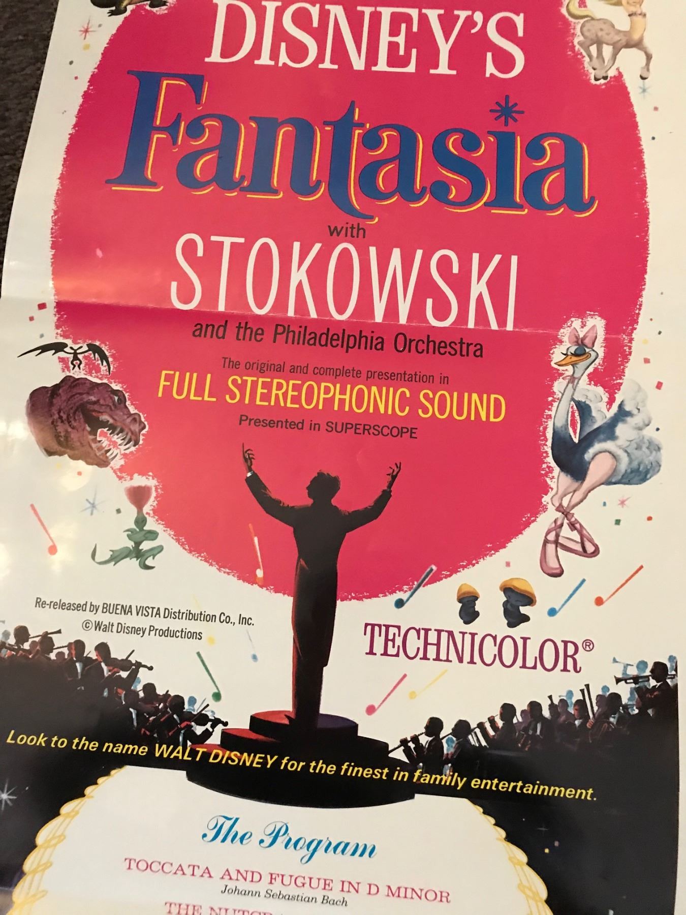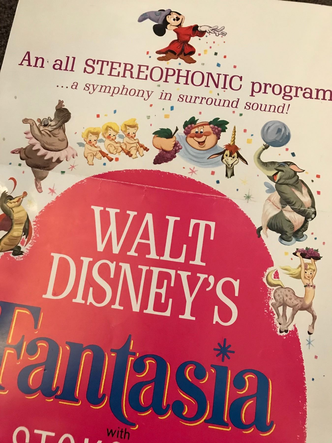 (Disney, c. 1963). A very large 84" x 41" Walt Disney "Fantasia" poster for the 1963 re-release of the classic 1940 film. The first time the film was presented in "full stereophonic sound" and the last re-release before the passing of Walt Disney. The poster is in good condition with normal wear from age and handling, including some markings on the lower part of the poster. Item comes with a Grand Circle Tour Auctions COA.