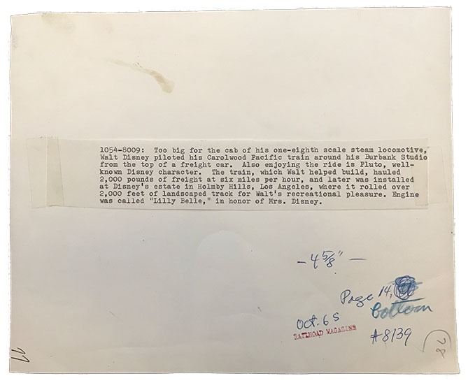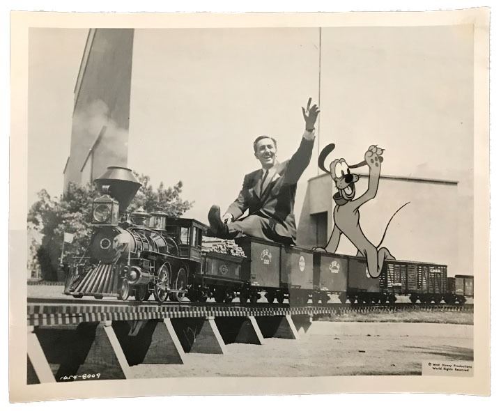 (Disney, c. 1950's). A rare Walt Disney photograph of Walt riding his famous Lilly Belle train around the Walt Disney Studios. Classic Disney animation character Pluto has been added to the photograph by the Studios for press release. The photograph is in good condition with normal wear from age and handling. Item comes with a Grand Circle Tour Auctions COA.