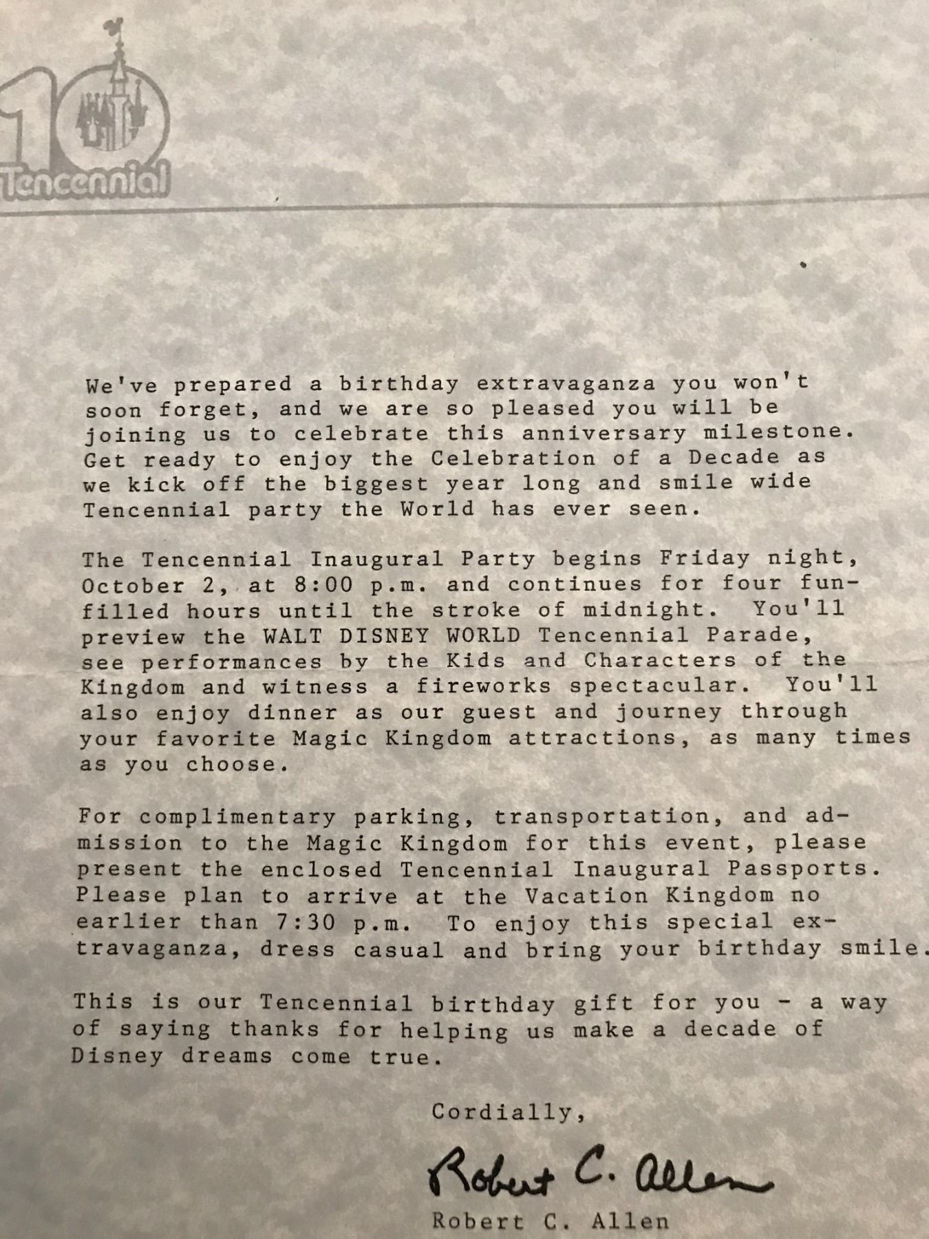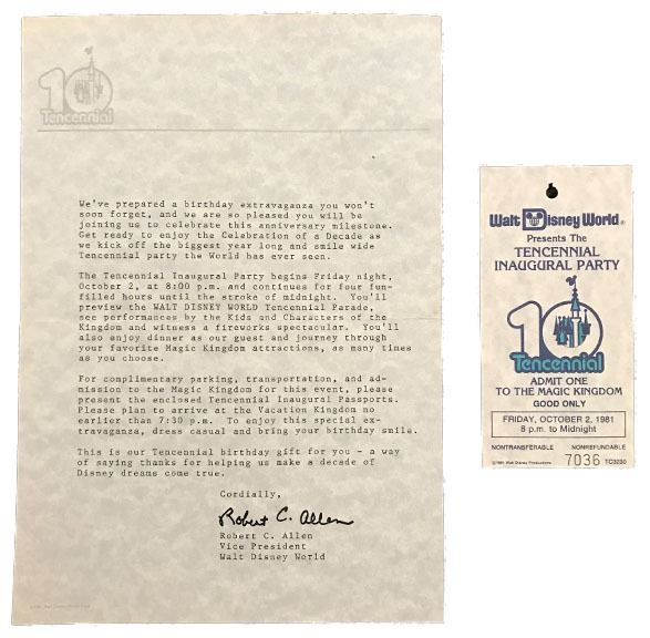 (Walt Disney World, c. 1981). A rare Walt Disney World 10th anniversary or Tencennial letter and ticket. The letter invites the recipient to a special event Tencennial Inaugural Party and comes from Robert C. Allen, the Vice President of Walt Disney World in 1981. The letter and ticket are in good condition with normal wear from age and handling. Item comes with a Grand Circle Tour Auctions COA.
