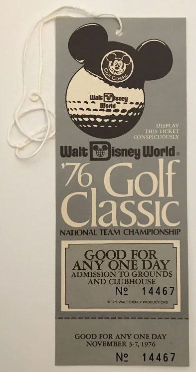 (Walt Disney World, c. 1976). A rare Walt Disney World Golf Classic unused ticket from 1976. The ticket is in good condition with normal wear from age and minimal handling. Item comes with a Grand Circle Tour Auctions COA.