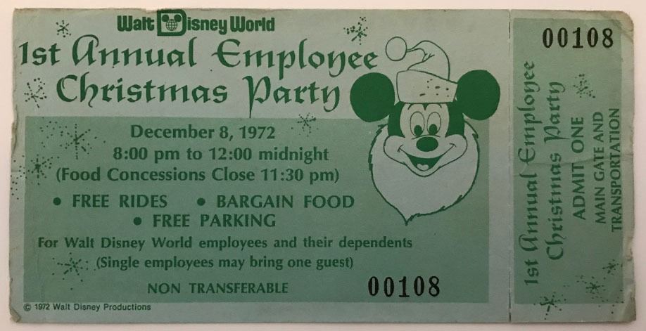 (Walt Disney World, c. 1972). A very rare unused Walt Disney World 1st annual Christmas party ticket. The ticket has some wear to it, especially around edges and including the backside, but these tickets are very rare to find and especially unused. Item comes with a Grand Circle Tour Auctions COA.