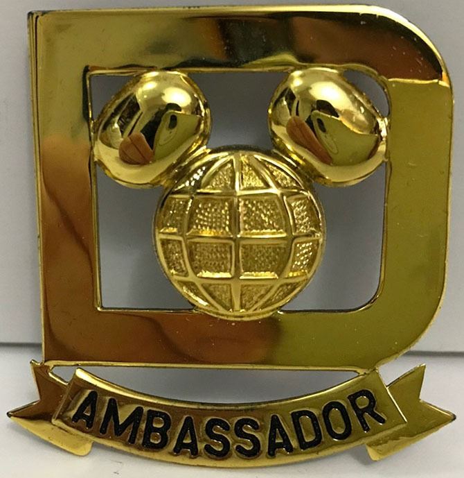 (Walt Disney World, c. 1990's-2000's). A rare, vintage Walt Disney World Ambassador pin. The pin has classic Mickey Mouse ears with a globe for the large circle, a symbol of Walt Disney World. Of these pin types, the "Tour Guides" are far more common as there are several tour guides that have worked at the park over the years. The ambassador pin is much more rare and more highly sought by collectors than the tour guide pin. The pin measures approximately 1.75" x 1.75" and is in good condition with normal wear from age and minimal handling.