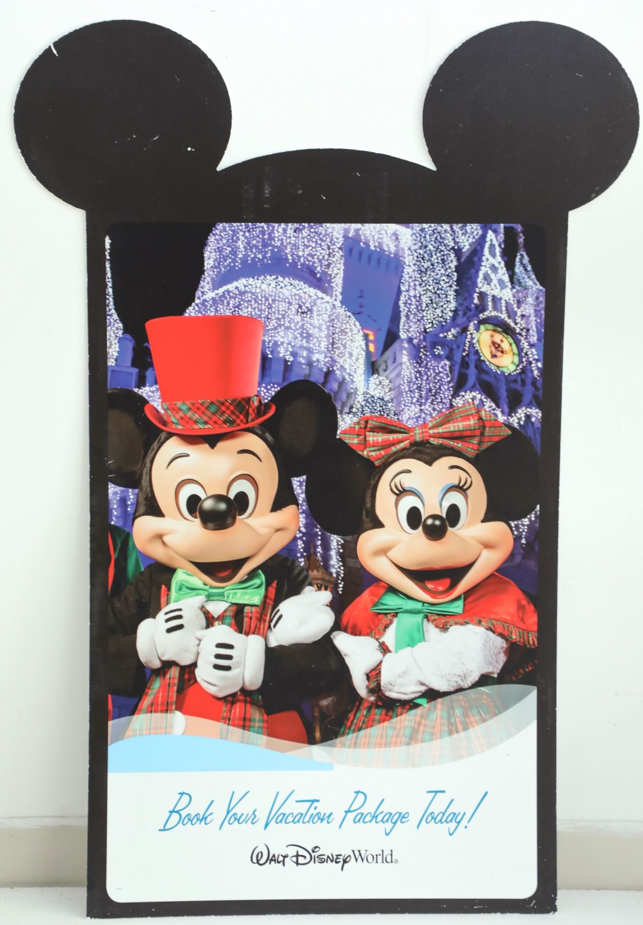 (Walt Disney World, c. 2000's). A Walt Disney World prop sign featuring Mickey Mouse & Minnie Mouse at holiday time. The sign is in good condition with normal wear from age and park use.