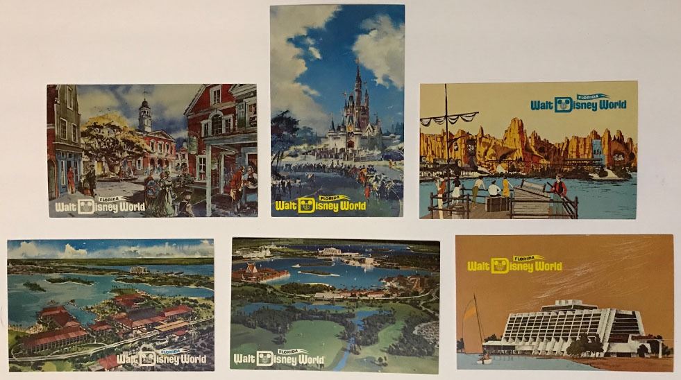 (Walt Disney World, c. 1971). Rare, vintage Walt Disney World pre-opening concept art postcards. In tradition with the first postcards of Disneyland being concept art, Walt Disney World likewise made their first available postcards based on concept art. These postcards were even available in Disneyland prior to the opening of Walt Disney World. The postcards are unused and are in good condition with normal wear from age and minimal handling.