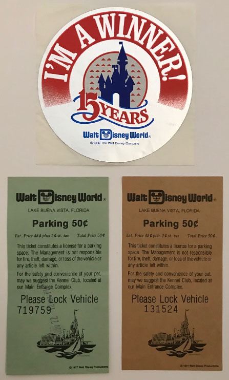 (Walt Disney World, c. 1970's). A lot of vintage Walt Disney World items including a 15th anniversary sticker and two vintage parking tickets. Items are in good condition with normal wear from age and handling. Item comes with a Grand Circle Tour Auctions COA.
