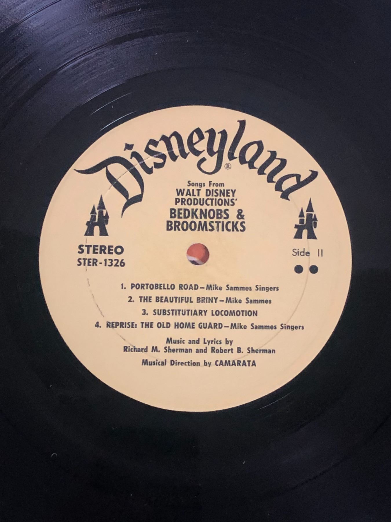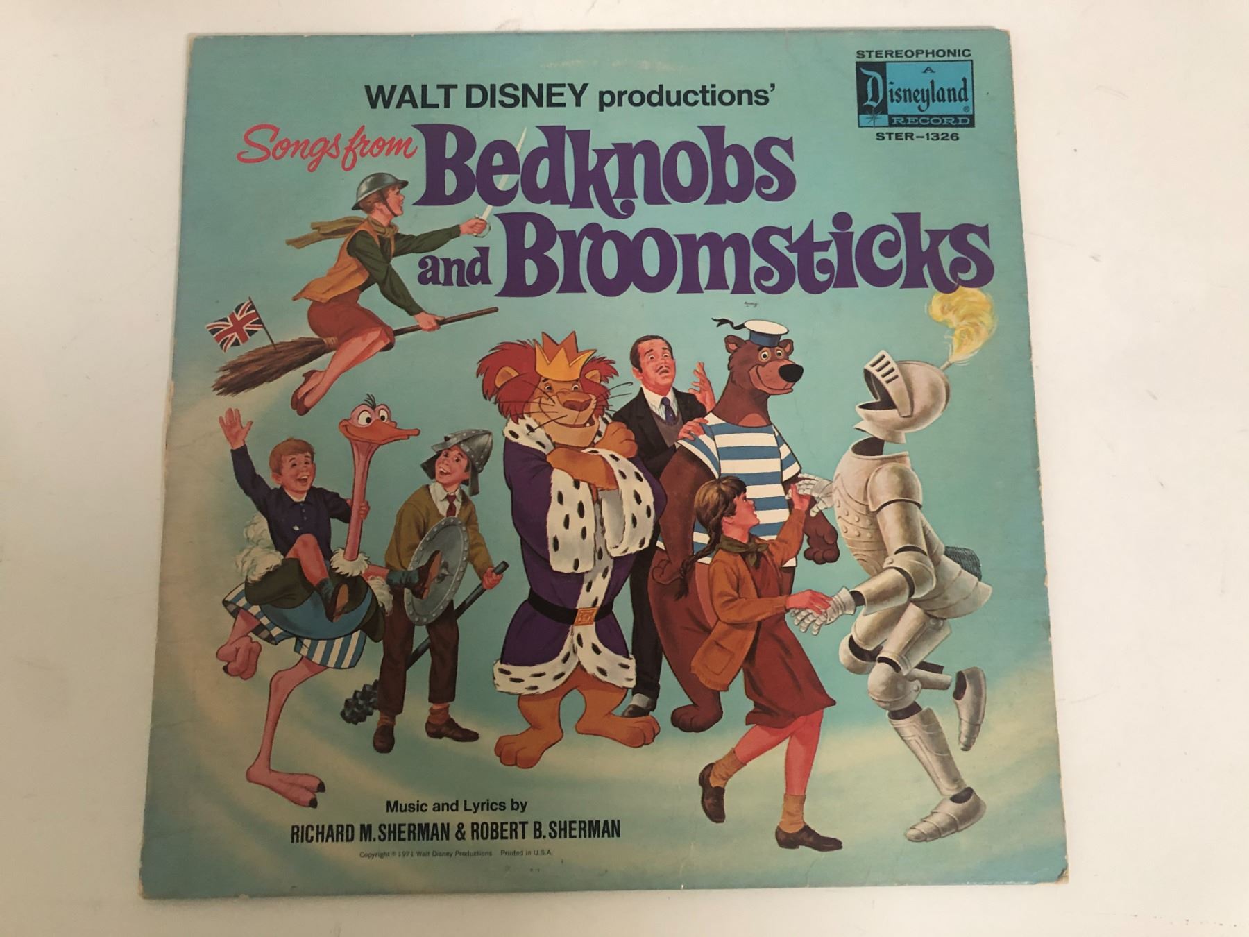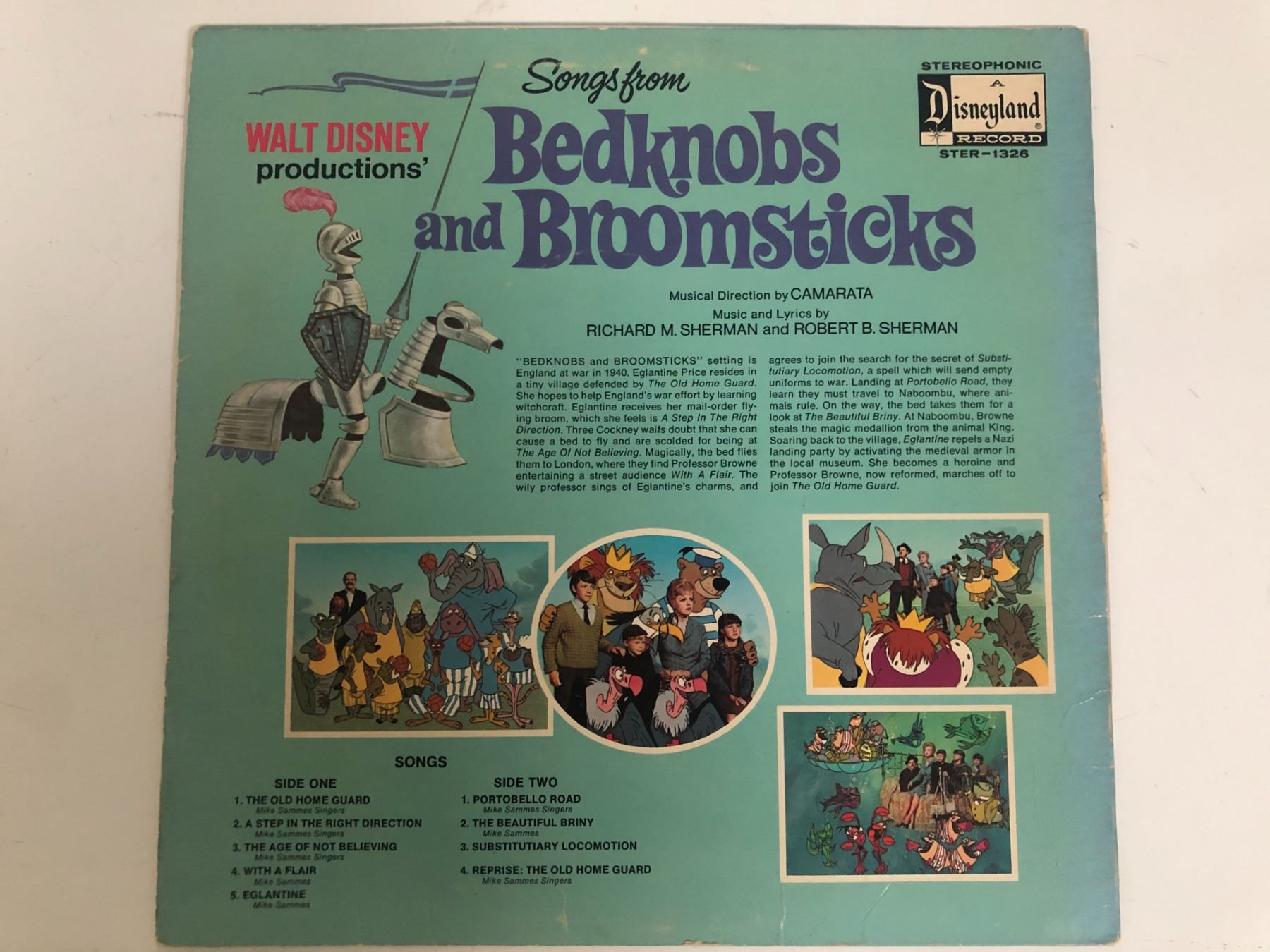 (Disney, c. 1971). Here's a rare Walt Disney's Bedknobs and Broomsticks record (STER-1326). The record is in good playable condition. The record cover is fair condition with wear from age and handling. Item comes with a Grand Circle Tour Auctions COA.