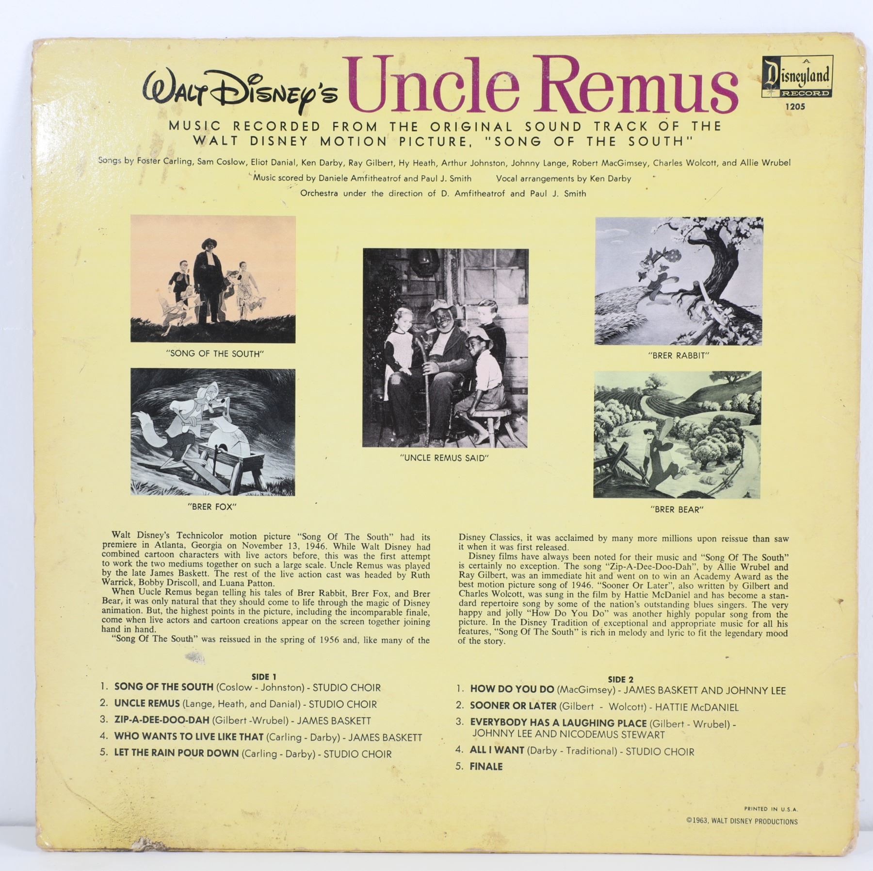 (Disney, c. 1963). Walt Disney's Uncle Remus music record. A 1963 vinyl 12" LP album that is in good condition with normal wear from age and handling, including edge wear, especially in the corners. Item comes with a Grand Circle Tour Auctions COA.