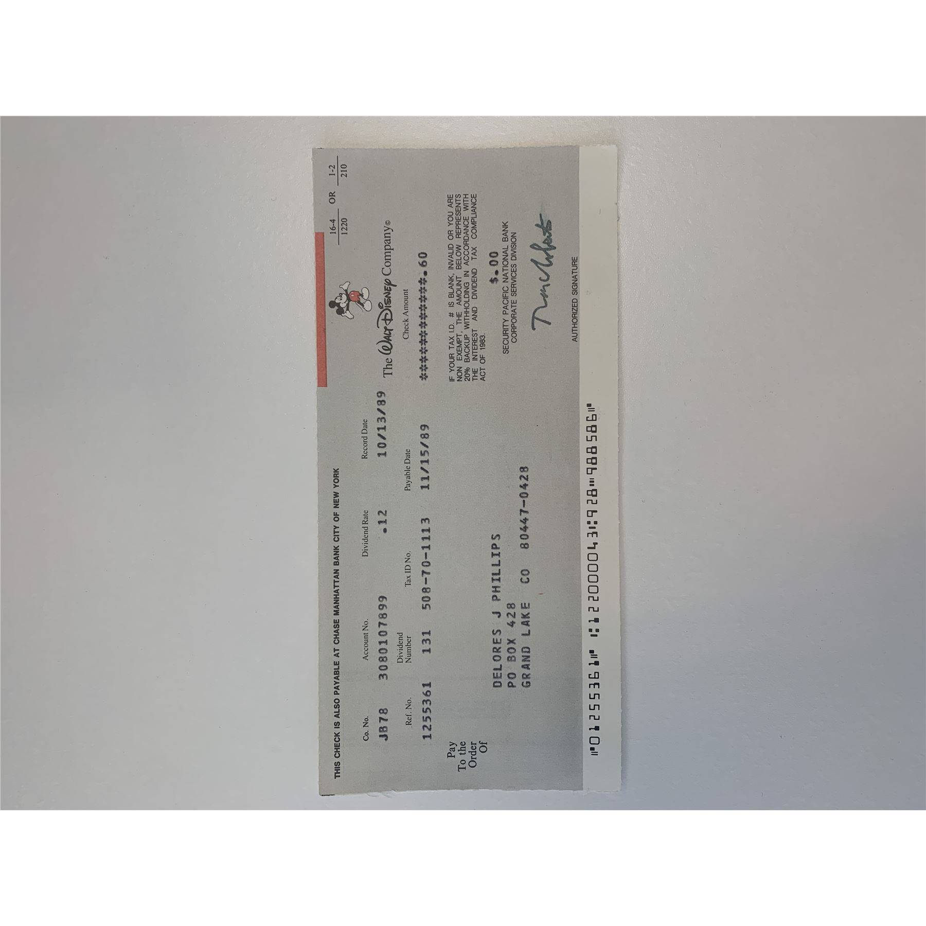 Walt Disney stock dividend check. 3x7 inches