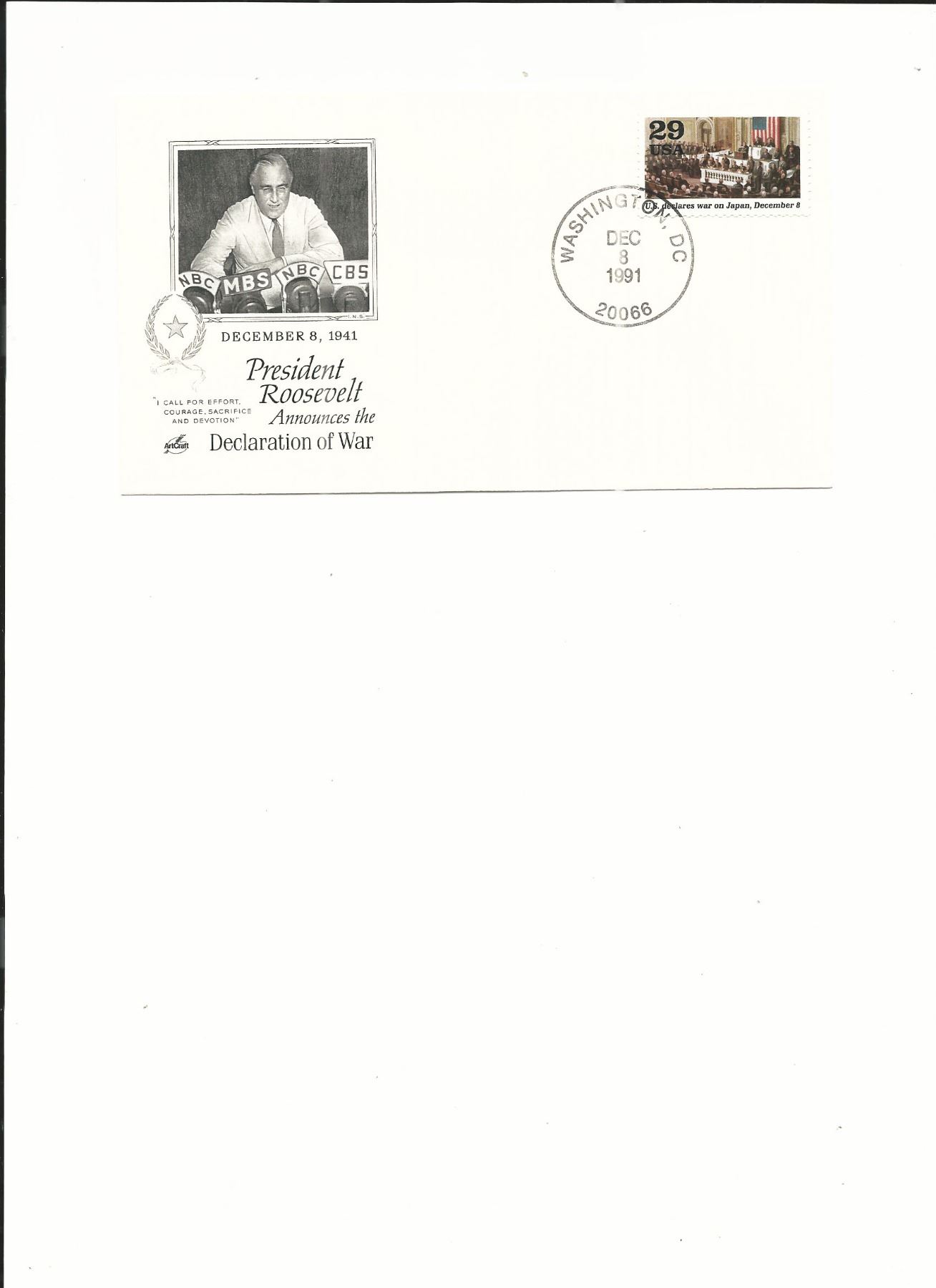 Washington D.C. - First Day Cover - 50th Anniversary - Roosevelt Announces Declaration of War - Dec 8th 1991