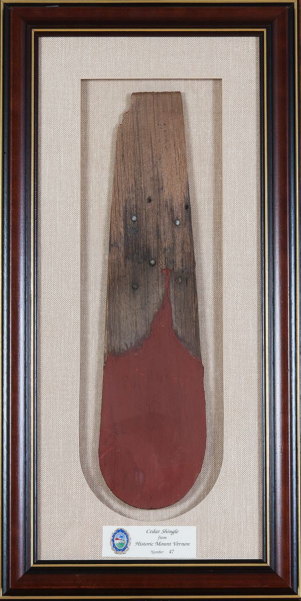 [washington, George] Cedar Shingle From Mount Vernon. 5 x 17� in., in a 13 x 26 in. frame. This specially-numbered shingle (Number 47), taken from the roof of Mount Vernon, is one of a limited quantity selected for framing. Made of cedar, this shingle was adapted from an 18th-century design used by Washington; however, the original red shingles were hand-rived from cypress. The roof on Mount Vernon is replaced approximately every 25 years. The shingles which are removed are framed and sold to pay the cost of the new roof. This shingle was placed on the roof around 1970 and was removed in 1993 in favor of a cypress shingle.