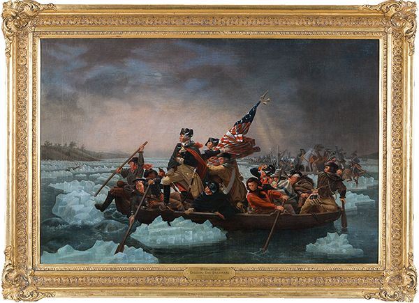 [washington, George] "Washington Crossing the Delaware," C. 1874, After Emanuel Leutze. Oil on canvas, 39 x 27 in.; in gold-leaf frame 48 x 35 in. Signed "W 1874", this painting is attributed to Thomas Worthington Whittridge for the Philadelphia Centennial in 1876. Whittredge (1820-1910) was a student of Emanuel Leutze's at the Dsseldorf Academy in Germany while Leutze was painting "Washington Crossing The Delaware," finished in 1850 and now hanging in the Metropolitan Museum of Art in New York City. In fact, Whittredge was one of the art students Leutze used as a model for figures in the painting; he supposedly served as the model for George Washington and also for a steersman. The painting depicts Washington standing stalwartly in the prow of a boat, leading his ragtag Continental Army troops across the icy Delaware in a surprise attack on Hessian troops quartered at New Jersey. The defeat of Johann Rall's Hessians was a psychological turning point in the Revolutionary War: