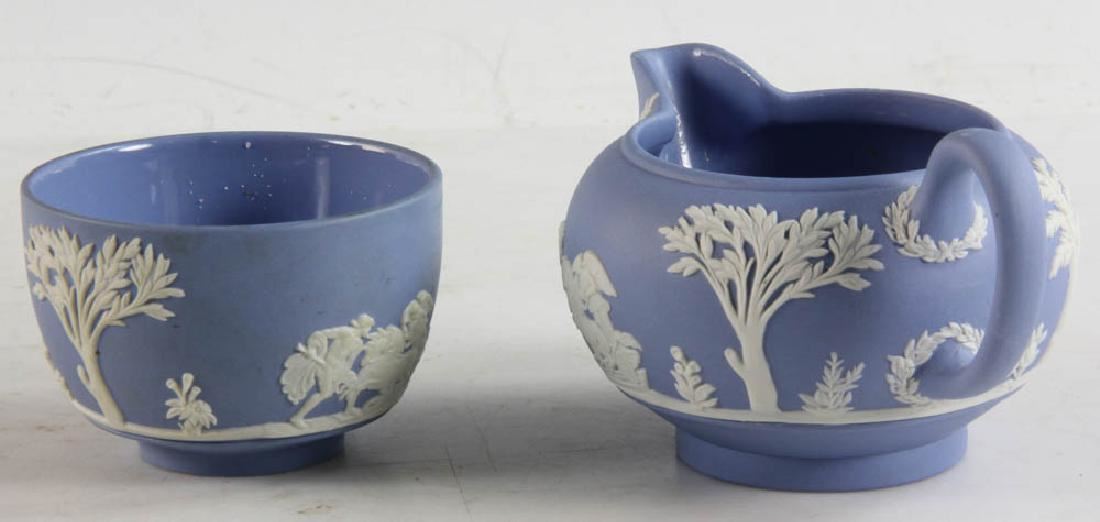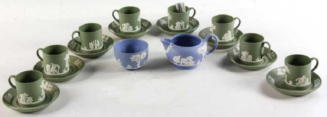 Collection of Wedgwood Jasperware to include green Jasperware demi-tasse cups and saucers and blue Jasperware cream and sugar. Provenance: Marblehead, Massachusetts estate.