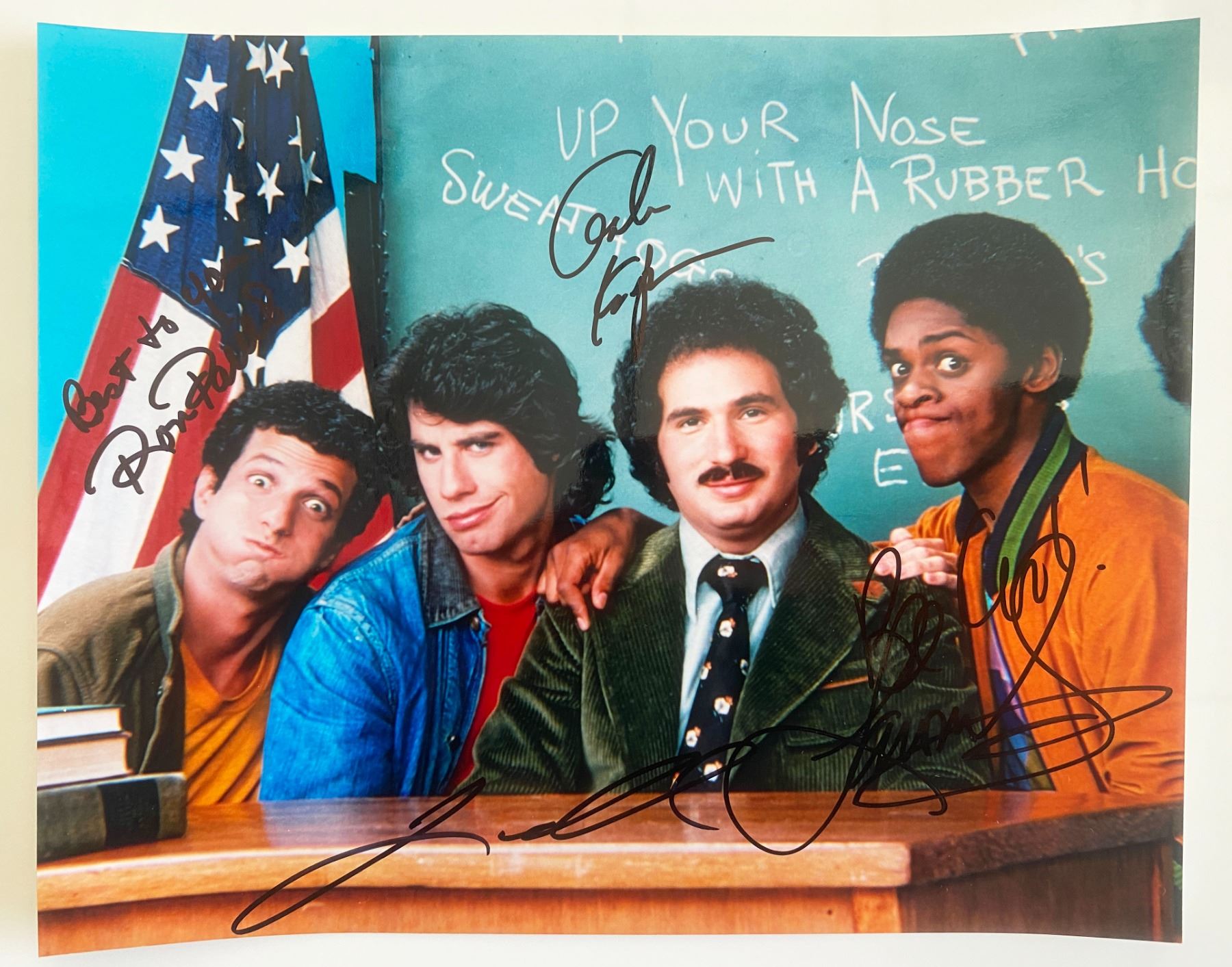 Welcome Back, Kotter signed cast photo autographed by Ron Palillo, John Travolta, Gabe Kaplan and Lawrence Hilton-Jacobs. 8x10 inches