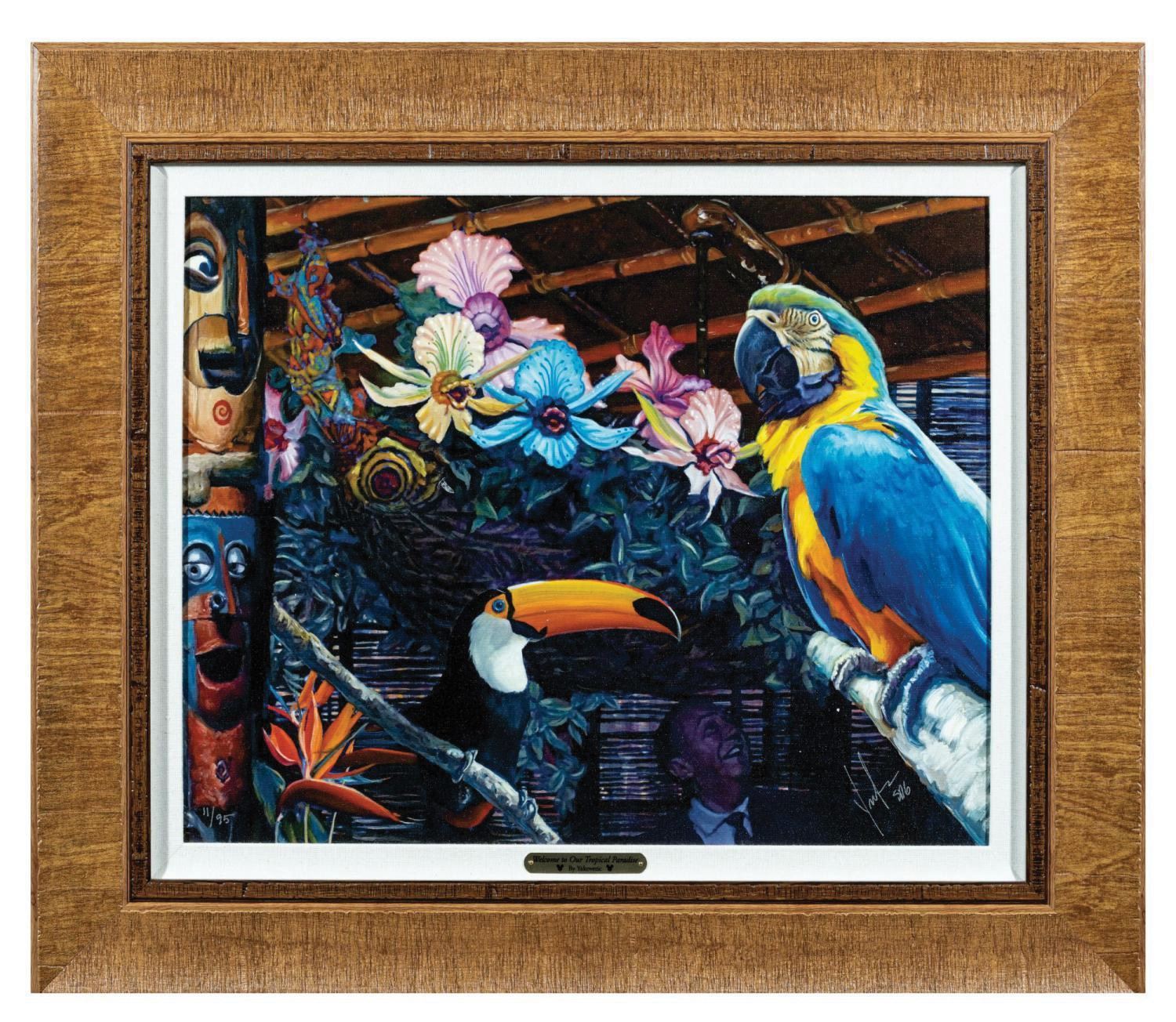 (Disneyland, 2013) A "Welcome to Our Tropical Paradise" print created by Yakovetic for "The Art of Disney Parks," coinciding with the 50th anniversary celebration of Walt Disney's Enchanted Tiki Room in 2013. The scene imagines true-life toucan and macaw actors performing inside the timeless Adventureland show, in the ‘Pronkstilleven' ostentatious still life form of the Old World Masters. Measuring 23.25"x27.25" the print numbered "11/95" displays in fine condition, retaining the original Certificate of Authenticity on reverse.