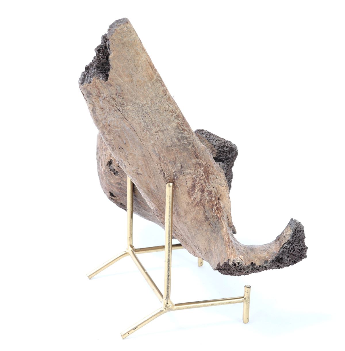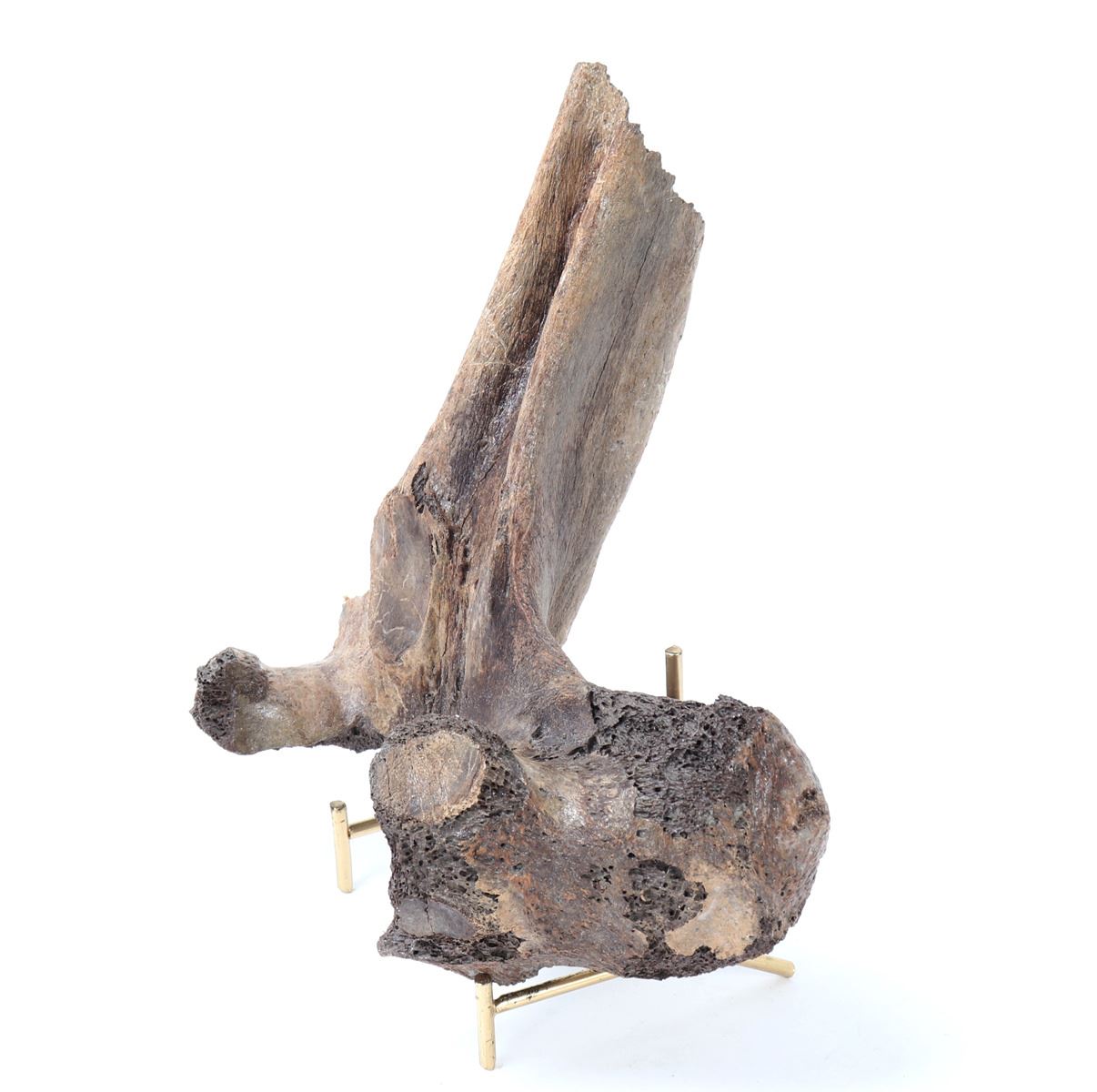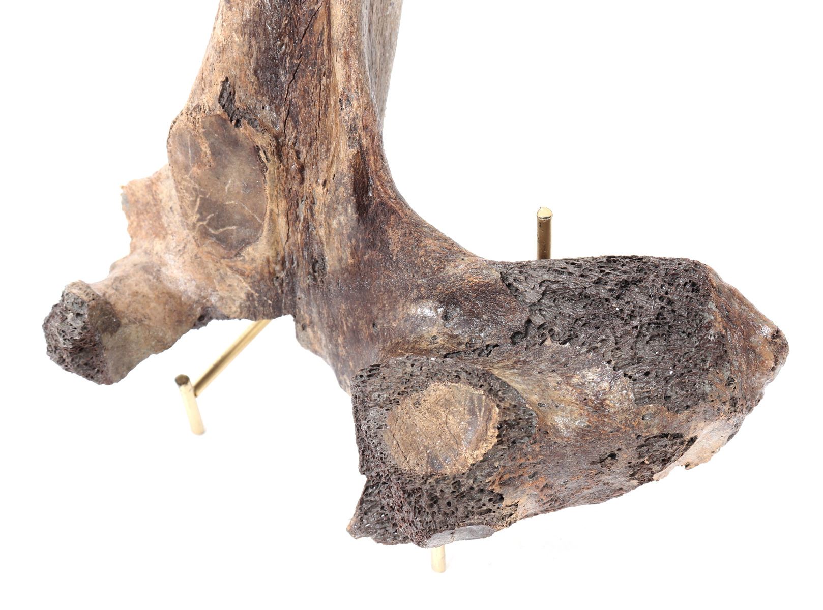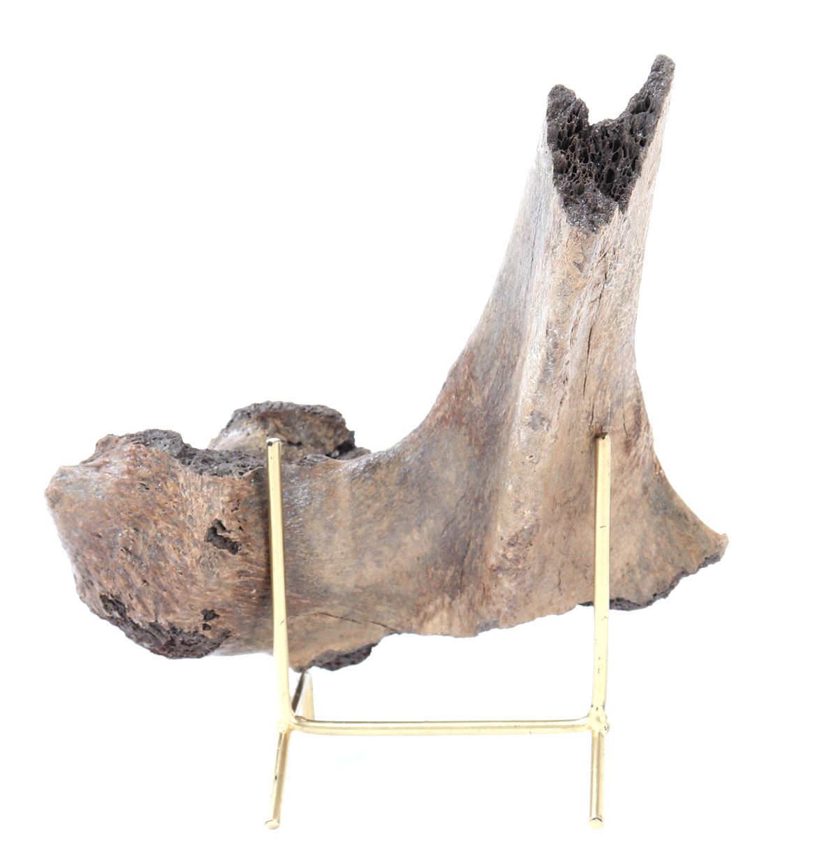 Ancient fossilized dinosaur bone likely a hip joint from a young dinosaur with ancient losses as shown. Earthen deposits and patina throughout from being underground for millions of years before being discovered. Size 7 1/4" L x 8 1/4" H, Weight 0.76 lb.. Condition: Well preserved condition.