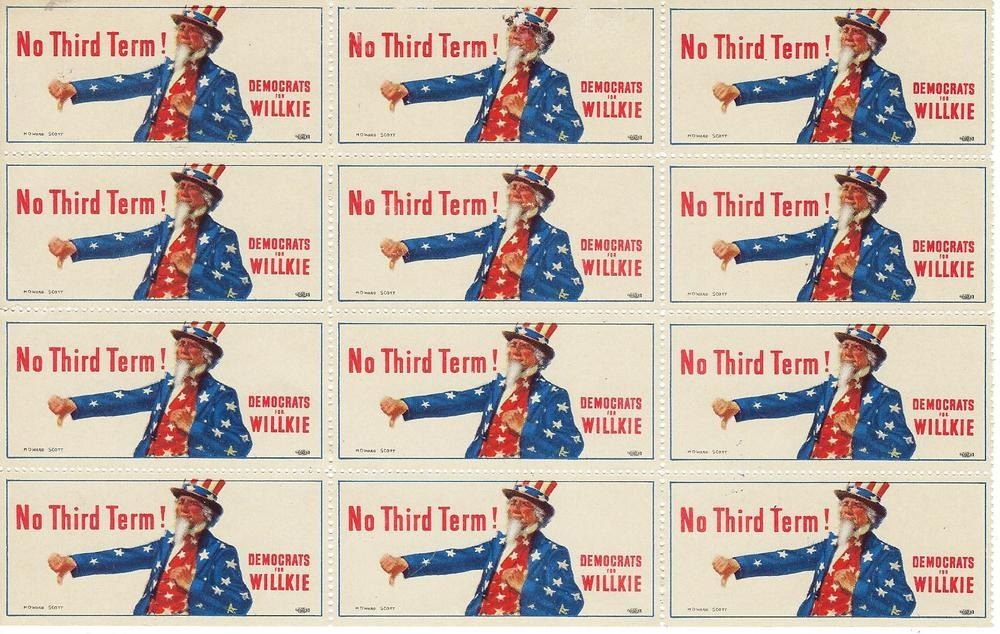 Wendell Willkie Poster Stamp. Original Sheet of 12 Stamps 1940. Postage style sticker promoting Republican candiate Wendell Willkie for President. Uncle Sam graphic with a thumbs down for "No Third Term" for President Franklin Roosevelt.