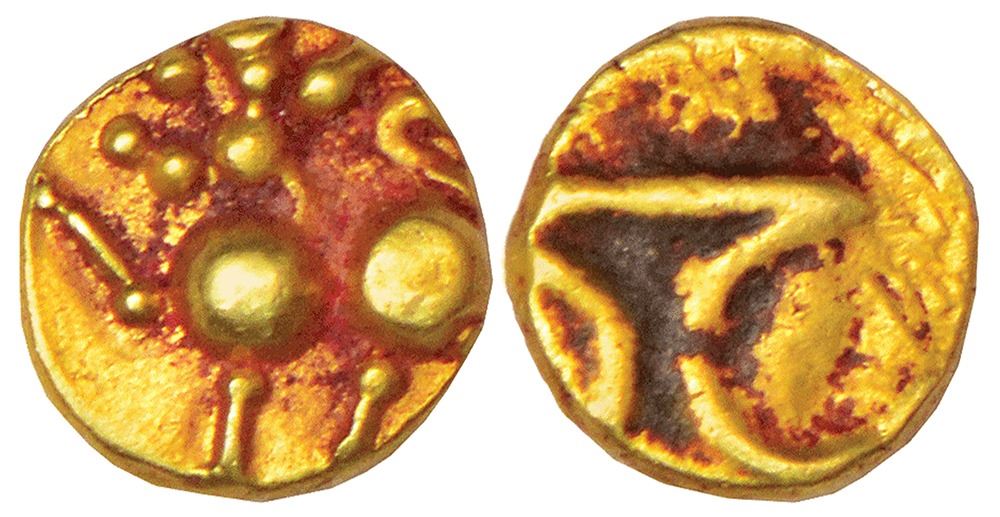 Western Chalukyas of Kalyani or feudatories, unattributed gold fanam, (c.1100-1200AD), 0.37g. Obv: stylized lion facing left with paw raised. Rev: Kannada letter Sa.