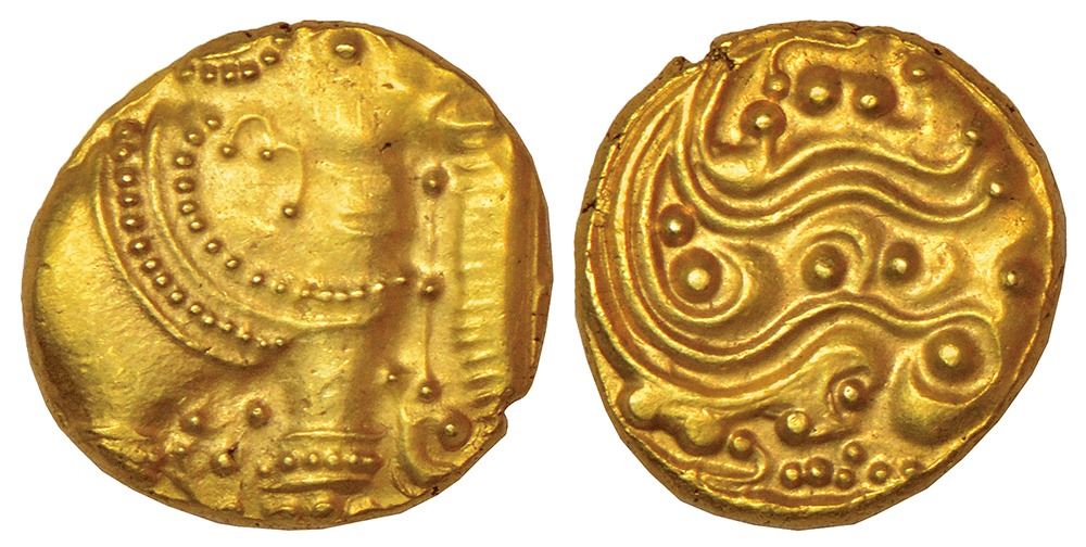 Western Gangas (10th-11th century AD), gold gajapati pagoda, MCSI-I 192-193, 3.90g. Obv: An ornate elephant standing facing right, There is a 2 layer pearl garland on the neck of the elephant. Rev: Ornamental floral scroll.