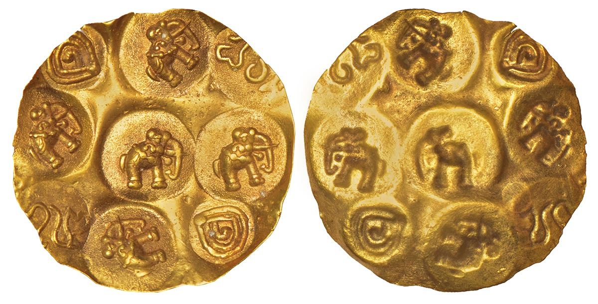 Western Gangas as feudatories of the Rashtrakutas, gold punch-marked Gadyana, repousse fabric (900-1000 AD), 3.79g, height: 30.84mm, width: 31.58mm. Obv: Nine punches struck deeply on a thin flan, 5x elephant standing in profile to right, 2x Kannada letters 'Shri', 1x Kannada legend Mara and 1x Kannada legend Pandya?.