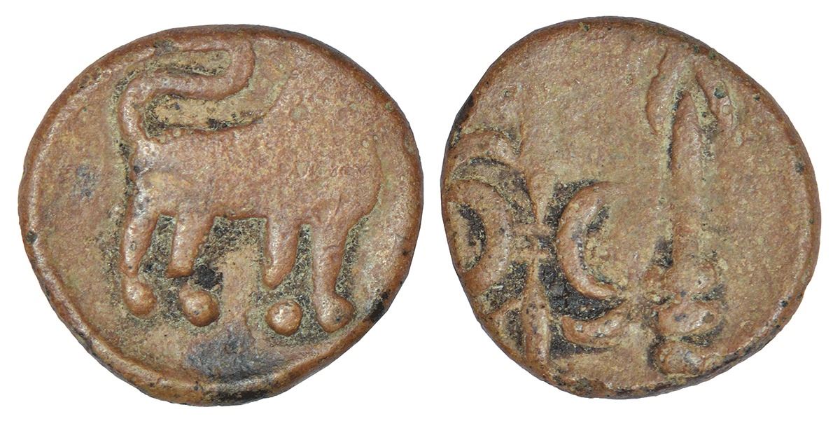Western Kshatrapas, Kshaharata house, uninscribed lead coin attributed to Nahapana (33-78 AD), Newase -Paithan/Bhokardan series, Fishman 9.2, 6.05g. Obv: lion standing with tail curled facing right. Rev: Thunderbolt and arrow.