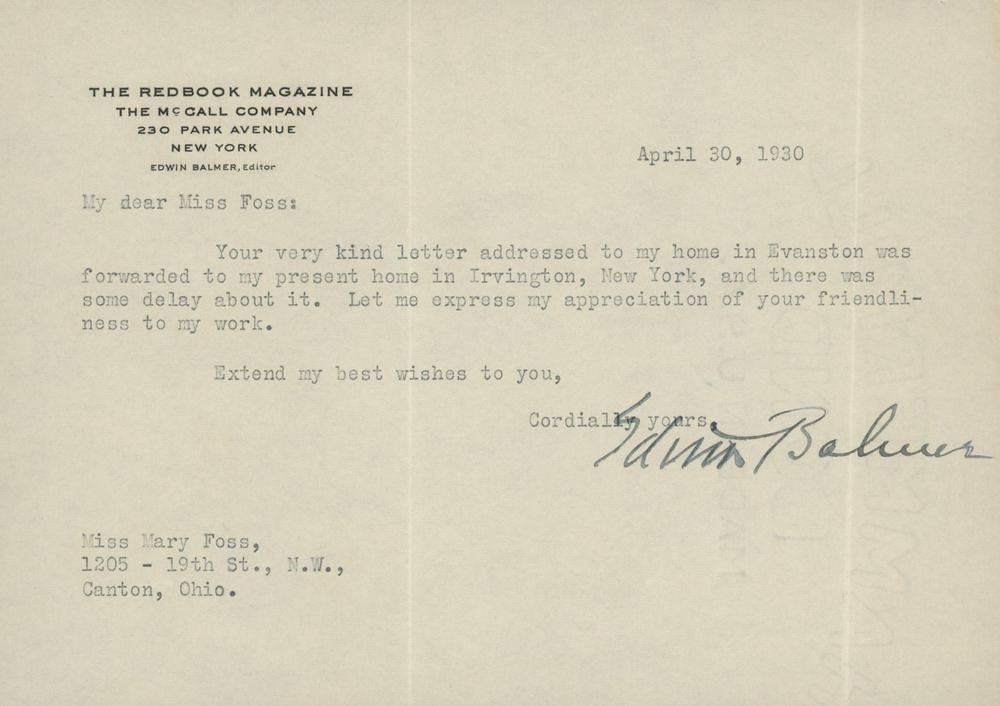 Personal note signed by Edwin Balmer dated April 30, 1930