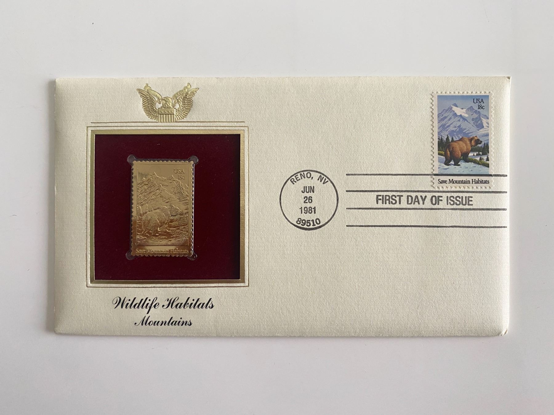 Wildlife Habitats Mountains Gold Stamp Replica First Day Cover. Reno, NV. Jun 26th 1981. 4x8 inches