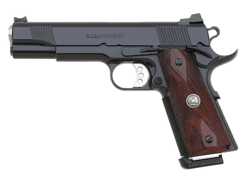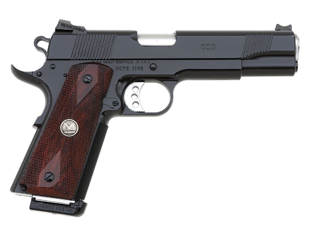 serial #WCPS1998, 45 ACP, 5'' barrel with an excellent bore. This finely crafted pistol shows minimal use and remains in wonderful condition. The pistol retains about 99% original black Armor-Tuff finish. The double diamond checkered exotic hardwood grips feature Wilson Combat medallions and remain in excellent condition with minor handling marks. This gun has numerous features including a fiber optic semi-ramp front sight, rear ''Battlesight'' with ''U'' notch and cocking ledge, ''Bullet proof'' extended thumb safety, fine checkering on the frontstrap and flat mainspring housing, undercut triggerguard, long skeletonized trigger with overtravel stop, beavertail safety with memory bump, fore and aft cocking serrations on the slide, trigger job, and Wilson's usual incredible accuracy job (test target is a five shot 1/4'' c-c group at 15 yards). It includes the factory soft case, a pair of Wilson Combat eight-round magazine with removable floorplate, Ed Brown seven-round magazine, Brownells and Wilson Combat bushing wrenches, trigger lock with a pair of keys, four Wilson Combat Shok Buff recoil spring buffers, and two spare sets of Wilson Combat three dot night sights that still faintly glow. A superb gun for a variety of defensive and shooting needs. (8B11718-2) {MODERN} (2000/3000)