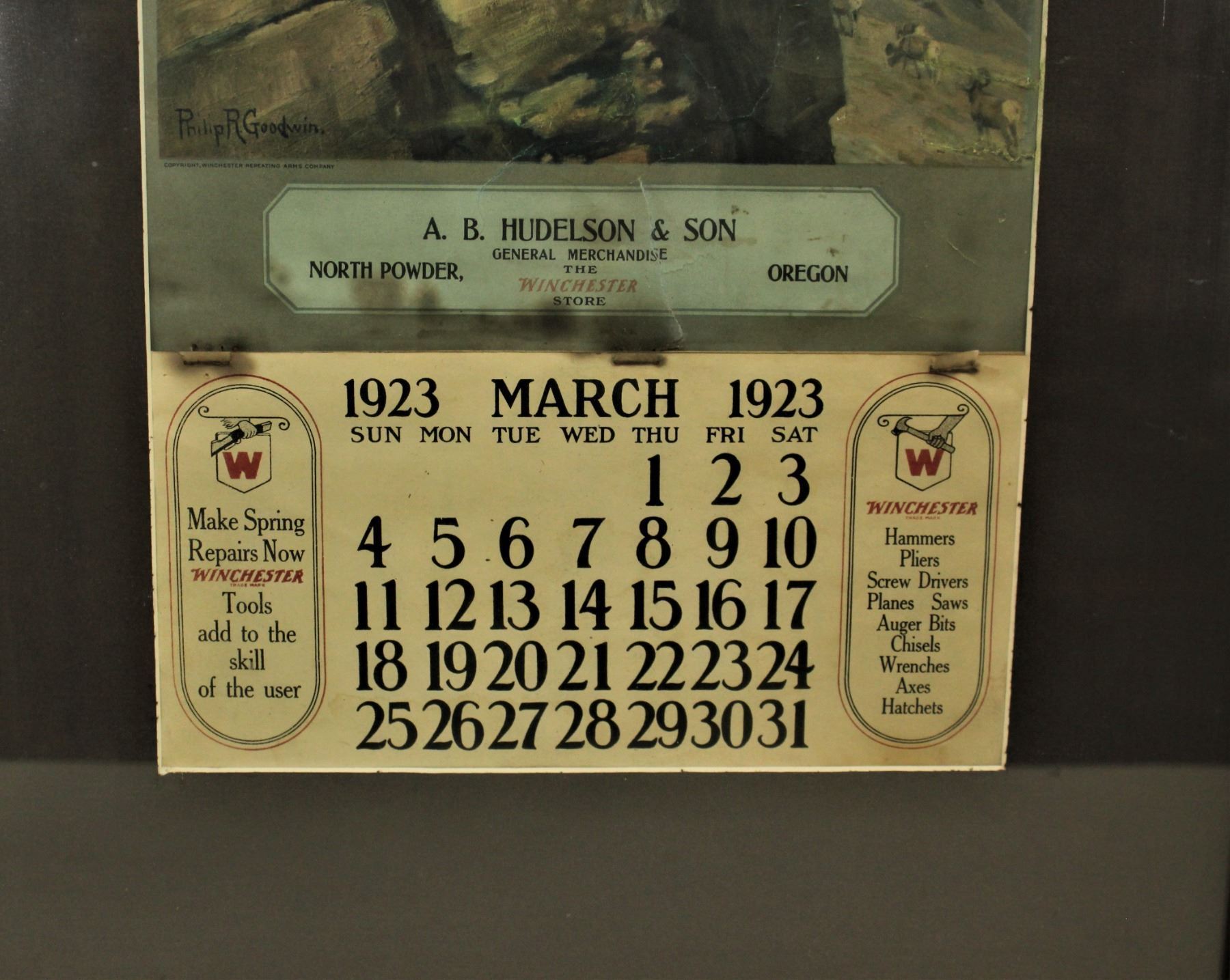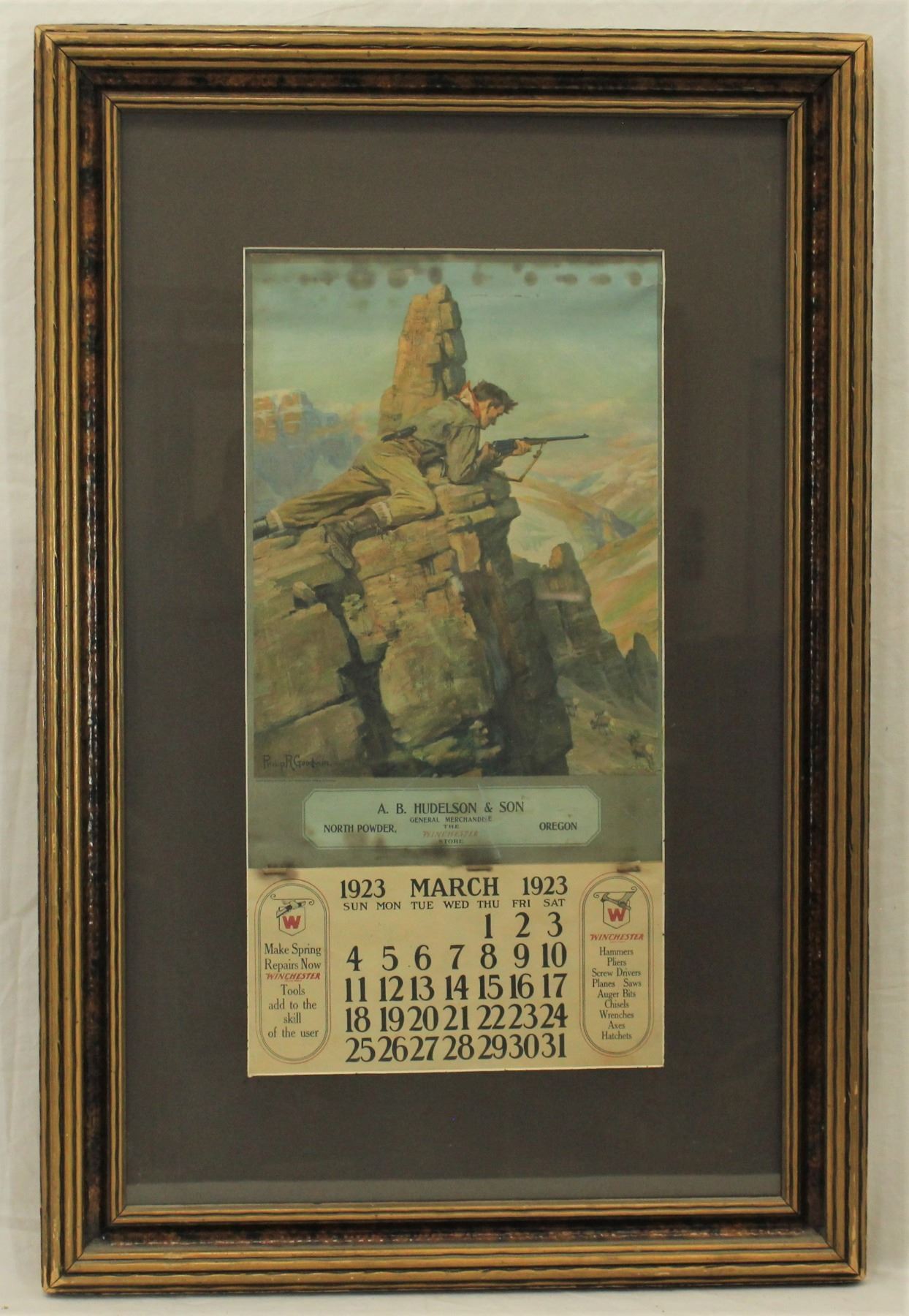 Highly collected Winchester advertising calendar with great graphic scene of hunter with an 1895 rifle, with advertising for an Oregon general store. Professionally framed and matted , sight measuring 10" x 19 1/2".