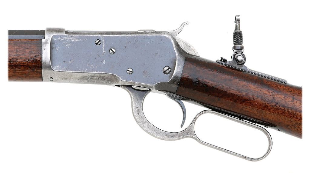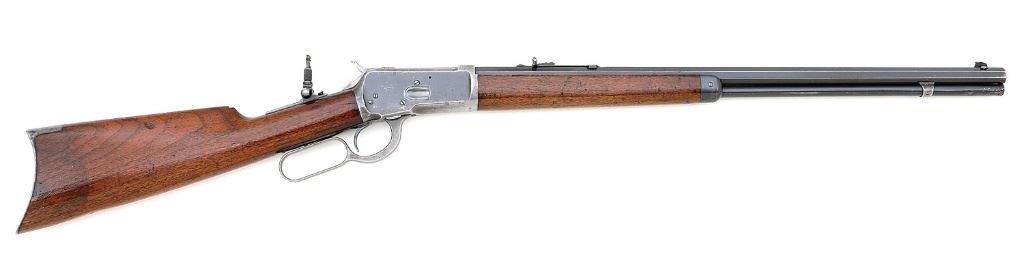 serial #268599, 32 W.C.F., 24'' octagon barrel with full magazine and a good bore with pinprick and intermittent light pitting but evident rifling throughout. The barrel and magazine tube retain about 85-90% original blue with light wear on the high edges and contact points, light thinning, and some scattered light dings and tool marks; the magazine hanger has worn to gray. The receiver retains about 40% original blue, primarily along the sides with the left thinning moderately, with the balance worn to a pewter-gray patina with light handling marks, small spots of pinprick pitting, and minor freckling, and the lever and hammer retain good case-hardened colors mellowing to gray with scattered specks of oxidation. The straight grip walnut stock and forend are in very good condition with a small notch at the comb tip, light dings and handling marks largely softened by time, and an older added finish; the steel curved buttplate has toned to gray with light oxidation staining and shallow pitting at the toe. The two-line Winchester address and other factory markings are intact and easily legible, the tang marking concealed beneath the aperture sight, and a few of the screws show light slot wear, the tang screw more moderate. The rifle is sighted with a Sheard bead front sight, adjustable sporting-style semi-buckhorn rear sight, and tang-mounted aperture rear sight; the front screw for the tang sight will not seat flush, but the sight still appears securely mounted. A handsome 1904-made Model 92. (14B11523-53) {C&R} [Jim Thrash Collection] (1000/1500)