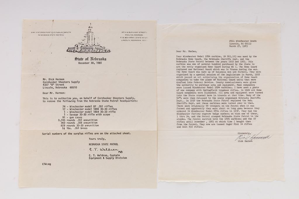 Winchester Model 1894 Lever Action Saddle Ring Carbine, #861103, .30 W.C.F. (.30-30) cal., 20" round barrel marked with maker's name, address and 1894 patent date, "Nickel Steel Barrel/Especially for Smokeless Powder" and caliber at left, has block-blade front and sliding-leaf rear sights, full-length mag tube below; receiver is marked with the model, maker's name, and trade mark pat. off. at top tang, has loop operating lever and left-side saddle ring and stud; oil-stained forend has single band, matching buttstock with carbine buttplate. Consignor has included two letters from the State of Nebraska, dated 1981 & 1983, stating that this Carbine was used by the Nebraska Home Guard, Nebraska Sheriff's Dept., and the Nebraska State Patrol between the years 1918 and 1981. Condition is fine retaining approx. 95% barrel, mag tube and lever blue, 50% on receiver, 25% buttplate; edges and markings are sharp. Stocks are sound and smooth with shallow nicks and dings, have nice color and original oil finish. Action is crisp, bore is brilliant with sharp rifling. Est.: $1,000-$1,500. (C&R)