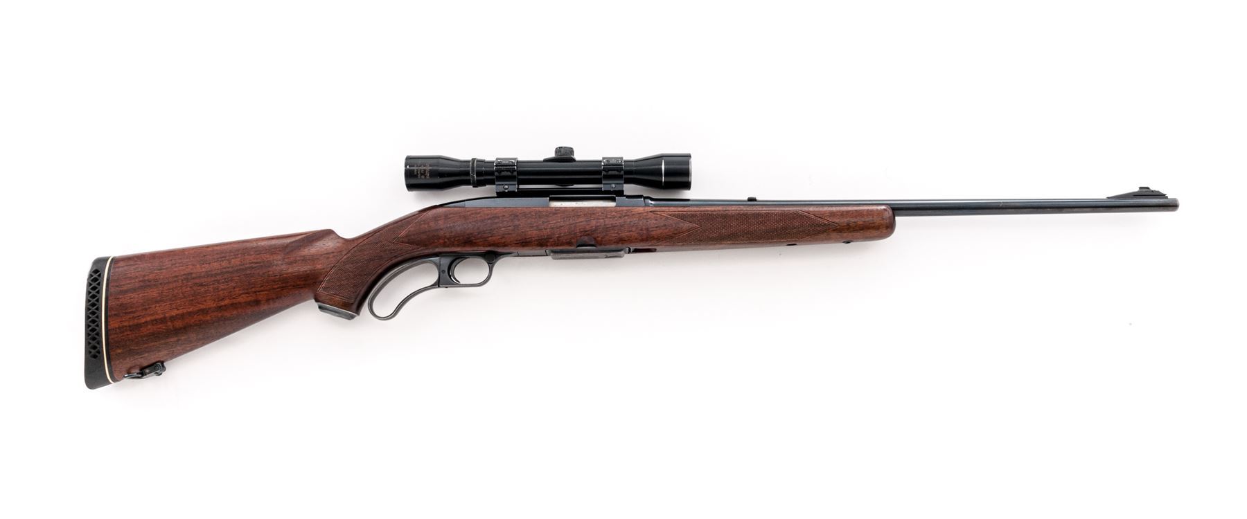 Winchester Model 88 Lever Action Rifle, #14575, .308 cal., 22'' barrel, blue finish, walnut stock, period added black rubber butt pad, with one factory magazine. Topped with a Japanese 4x scope on Weaver mounts. Mfg'd 1955. Condition is fine retaining approx. 95% lightly thinning blue. Stock shows light field use, with just minor flattening to checks. Good action, bright bore, clear scope optics and simple crosshair reticle; elevation adjustment knob cover is missing. Est.: $350-$500. (C&R)