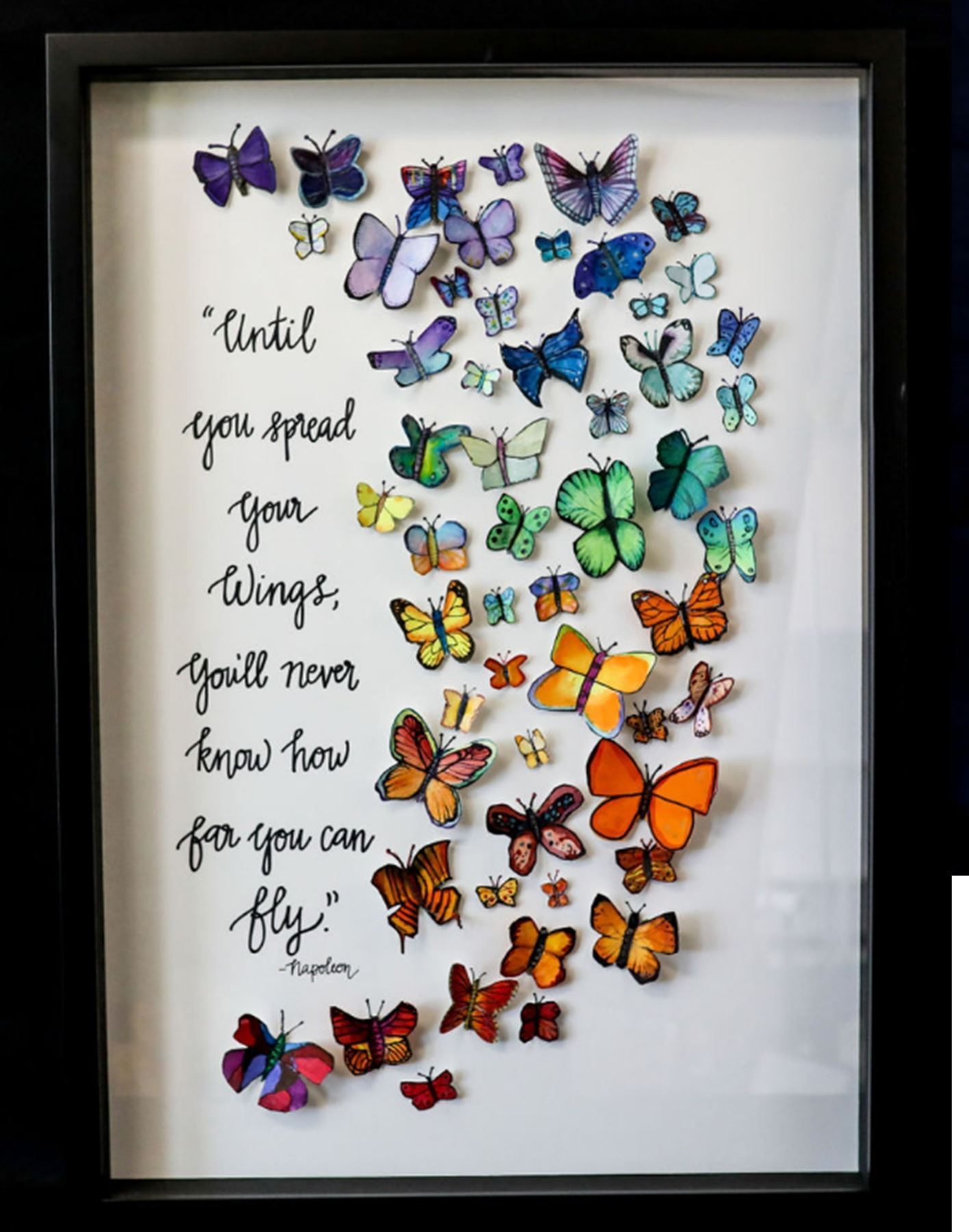 Each student in Mrs. McClure’s sixth grade class created colorful butterflies using traditional watercolor techniques. They were given little direction as to which colors or designs to use, which shows the incredible versatility and individuality of each of the students. Arranged next to a classic quote, “Until you spread your wings, you’ll never know how far you can fly,“ the partnership between the message and the colorful butterflies creates a fascinating, inspirational, and colorful work of art that will brighten any home.
