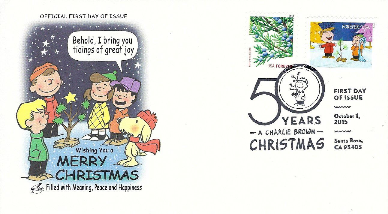 Wishing You a Merry Christmas - Filled with Meaning, Peace and Happiness - Celebrating 50 Years "A Charlie Brown Christmas" - First Day of Issue - October 1, 2015 - Santa Rosa, CA 95403 - Peanuts is a syndicated daily and Sunday American comic strip written and illustrated by Charles M. Schulz that ran from October 2, 1950, to February 13, 2000, continuing in reruns afterward. Peanuts is among the most popular and influential in the history of comic strips, with 17,897 strips published in all, making it "arguably the longest story ever told by one human being".