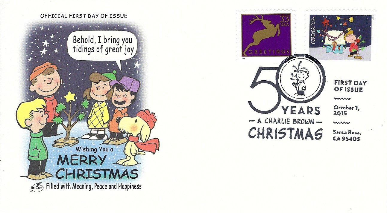 Wishing You a Merry Christmas - Filled with Meaning, Peace and Happiness - Celebrating 50 Years "A Charlie Brown Christmas" - First Day of Issue - October 1, 2015 - Santa Rosa, CA 95403 - Peanuts is a syndicated daily and Sunday American comic strip written and illustrated by Charles M. Schulz that ran from October 2, 1950, to February 13, 2000, continuing in reruns afterward. Peanuts is among the most popular and influential in the history of comic strips, with 17,897 strips published in all, making it "arguably the longest story ever told by one human being".