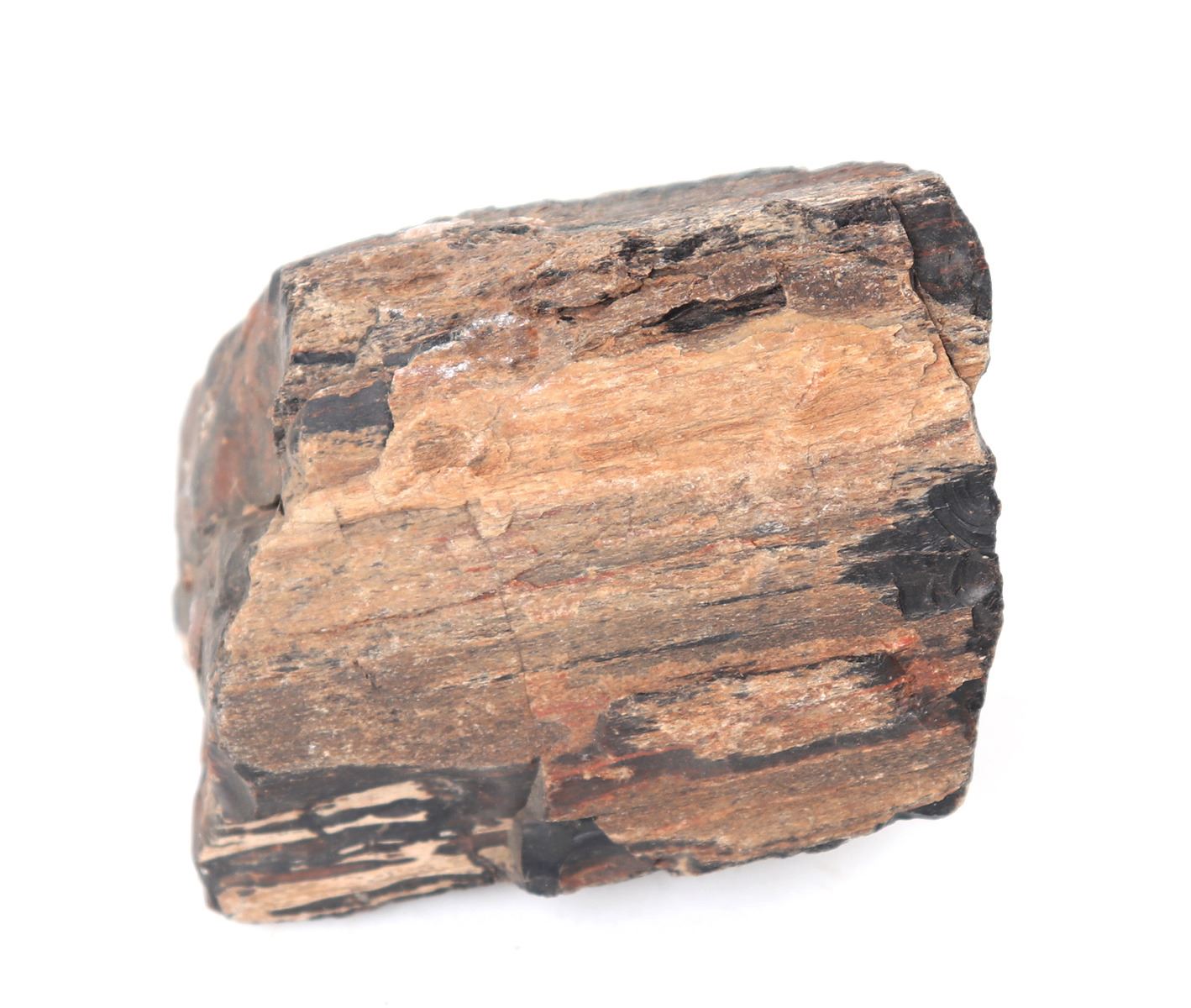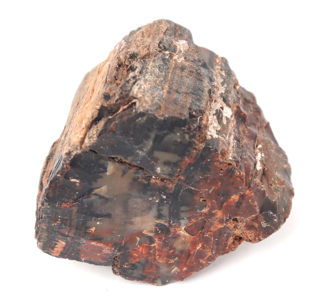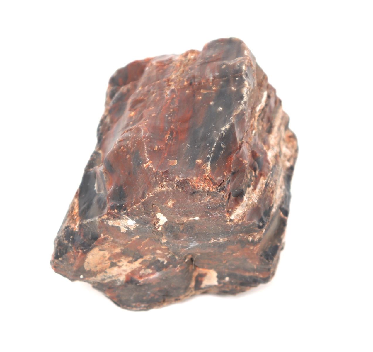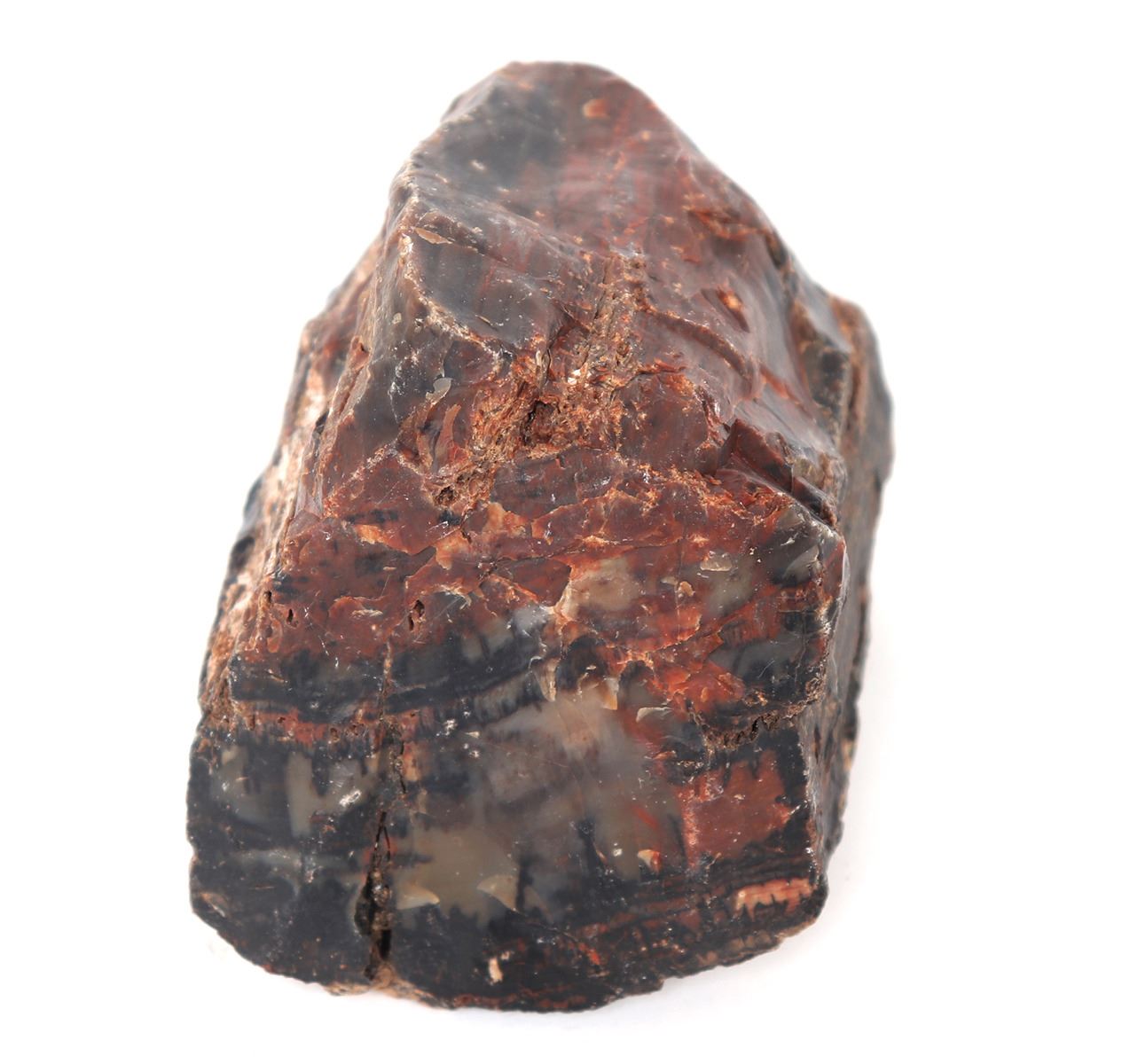 Paperweight sized piece of fossilized or petrified wood, with deep red and green coloring throughout. Size 3 1/4" H, 3 1/4" W. Condition: Good preserved condition.