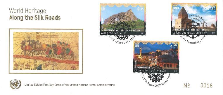 The United Nations Postal Administration (UNPA) issued a series of World Heritage stamps on 3 August 2017 featuring sites that lie ‘Along the Silk Roads’. In this set: Sulaiman-Too Sacred Mountain in Kyrgyzstan ($1.15); Kunya-Urgench in Turkmenistan (CHF 1,50); and the City of Safranbolu in Turkey (€ 1,70).