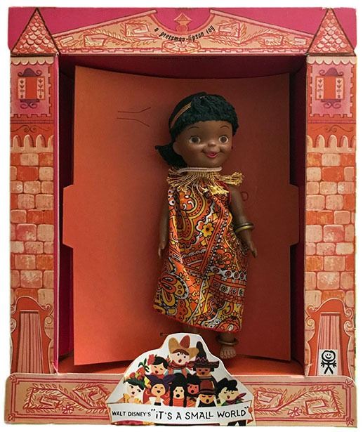 (New York World's Fair, c. 1964). The 1964 New York World's Fair saw the premiere of two famous Disneyland attractions, "it's a small world" and "Great Moments with Mr. Lincoln." Offered here is an "it's a small world" Africa doll still in its box and sold at the New York World's Fair. The doll is in very good condition being still sealed inside the box. The box has moderate damage to it, including adhesive tears, but overall is still in one piece.