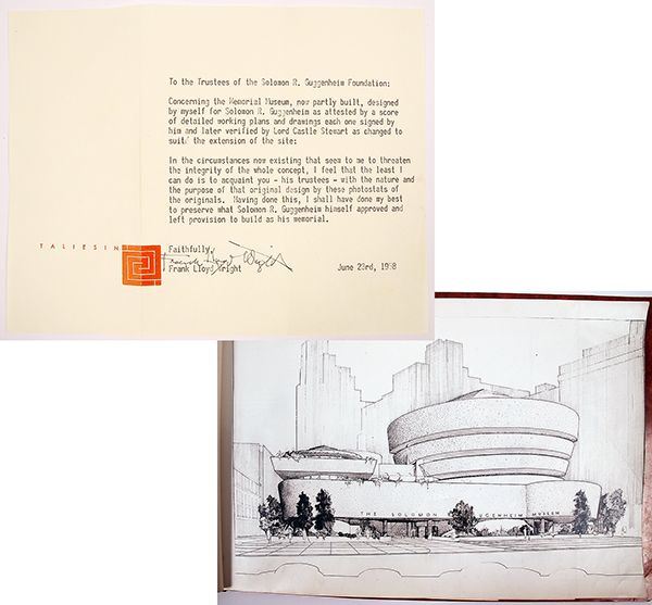 Wright's frustration at continuing delays and changes is evident in this letter, which he sent to the trustees in 1958. Typed letter signed, on Taliesin letterhead, 1 page, 8� x 11 in., Spring Green, Wisconsin, June 23, 1958, addressed "To the Trustees of the Solomon R. Guggenheim Foundation." The envelope has "to Mr. Michael Wettach" typed on the flap; Wettach (1932-1999) was one of the Guggenheim trustees and a grandson of Solomon R. Guggenheim. In part: "Concerning the Memorial Museum, now partly built, designed by myself for Solomon R. Guggenheim as attested by a score of detailed working plans and drawings each one signed by him and later verified by Lord Castle Stewart as changed to suit the extension of the site: In the circumstances now existing that seem to me to threaten the integrity of the whole concept, I feel that the least I can do is to acquaint you - his trustees - with the nature and the purpose of that original design by these photostats of the originals. Having done this, I shall have done my best to preserve what Solomon R. Guggenheim himself approved and left provision to build as his memorial. Faithfully, Frank Lloyd Wright."