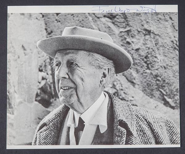 Wright, Frank Lloyd (1867-1952) (1867-1959) American architect; leading designer of modern private dwellings; his larger works include the Guggenheim Museum of Art in New York City and the Imperial Hotel in Tokyo. Photo from a publication ("The Natural House" is on verso) signed in the top border with a fountain pen in blue ink, n.p., n.d. A bust-length image of an older, smiling Wright.