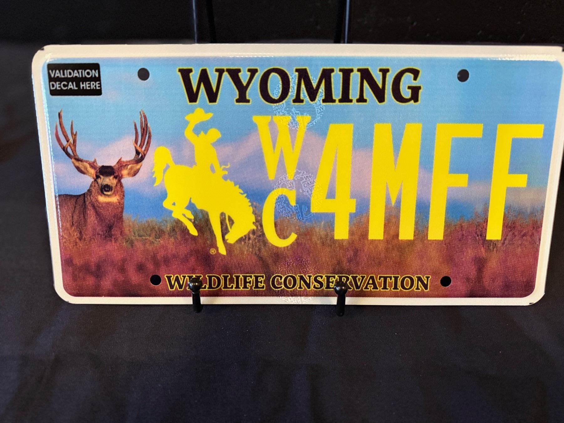 Add another piece of history to your collection. This is the first conservation license plate of Wyoming. A bill passed in 2018 through the legislation and an idea brought forth by the Muley Fanatic Foundation. This plate was available for Wyoming motorist in January 2019 that featured a mule deer. Funds from this plate goes direct to an account used only for wildlife-vehicle collision projects, such as overpasses, underpasses, and roadway high fence.