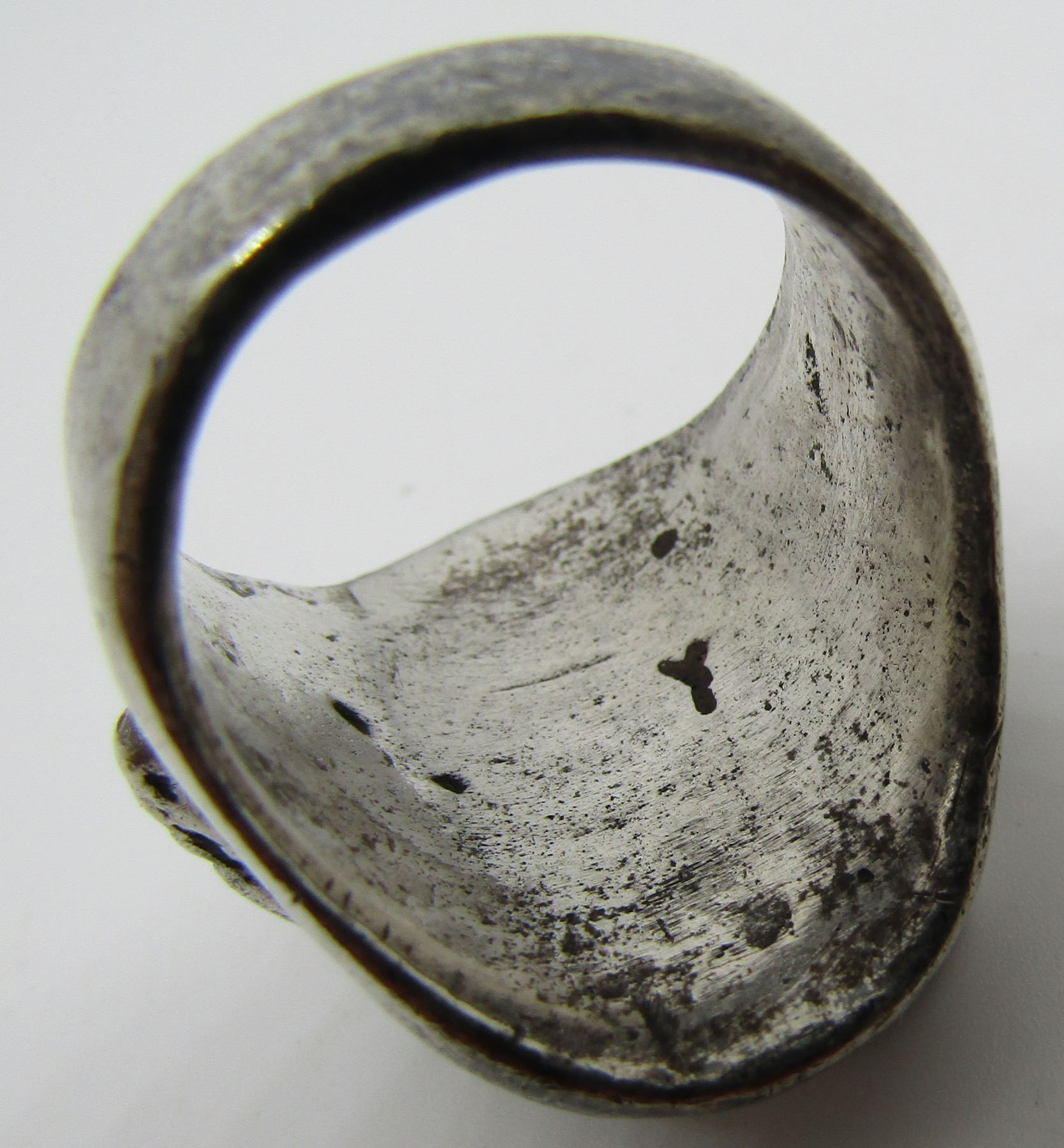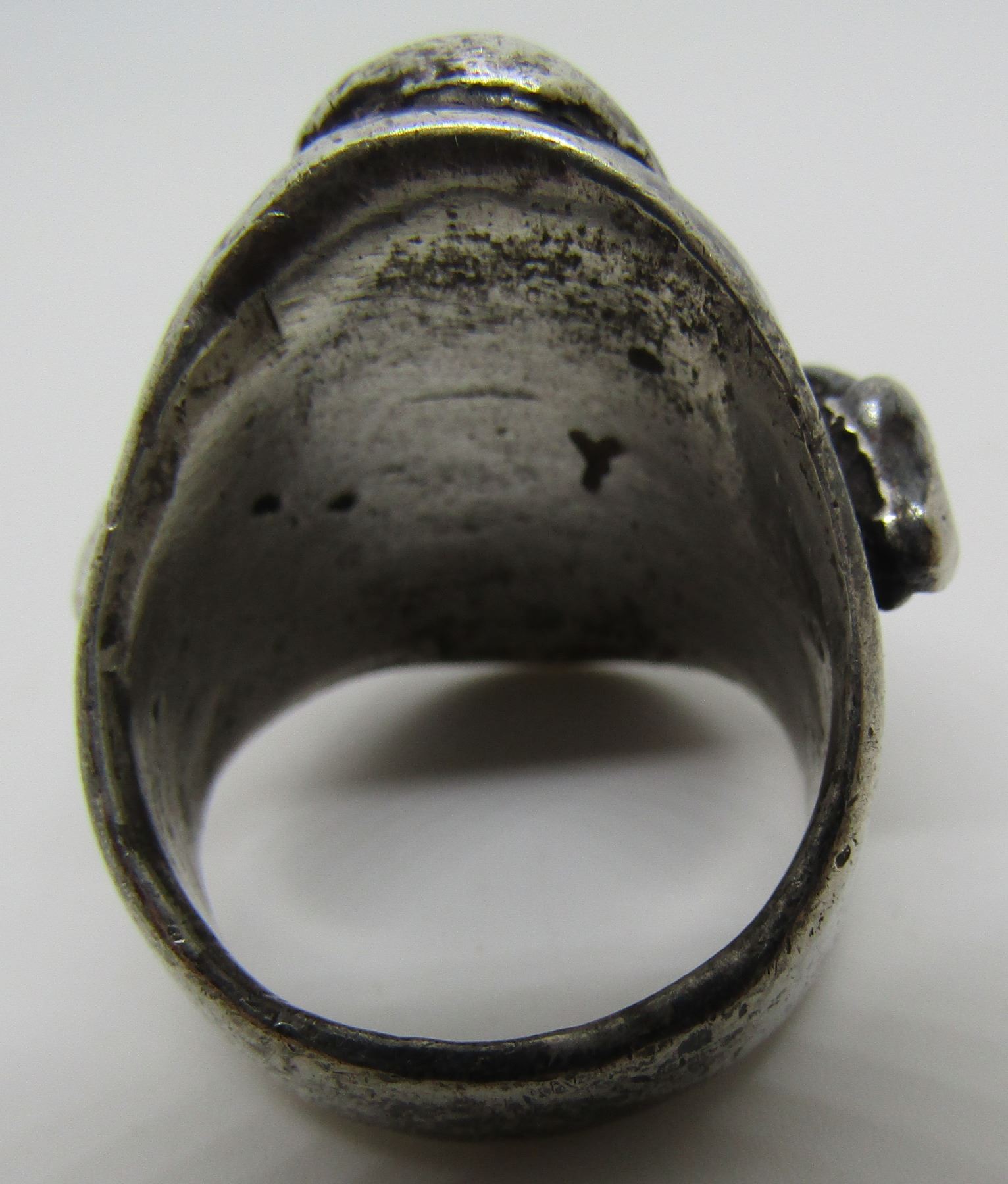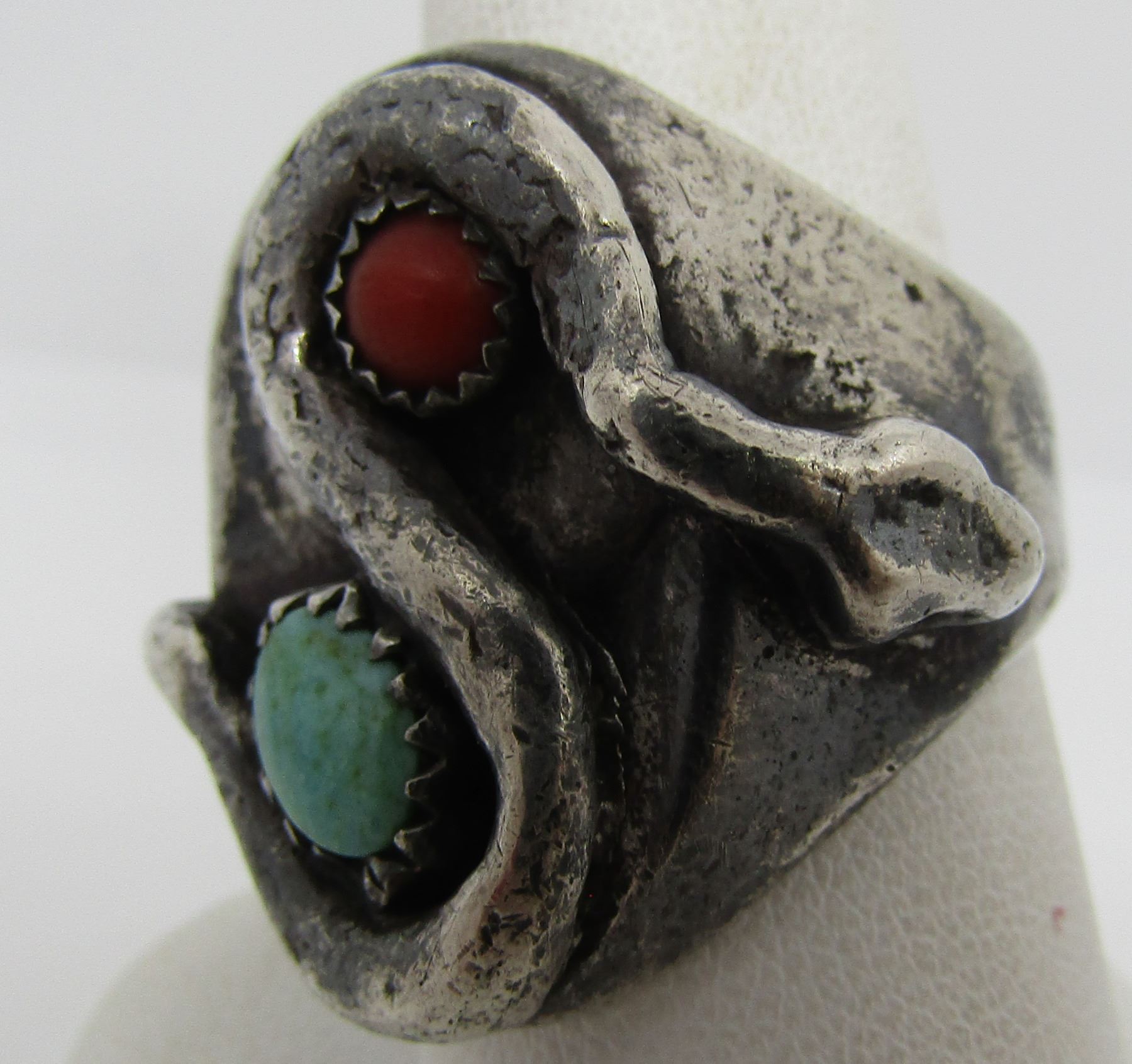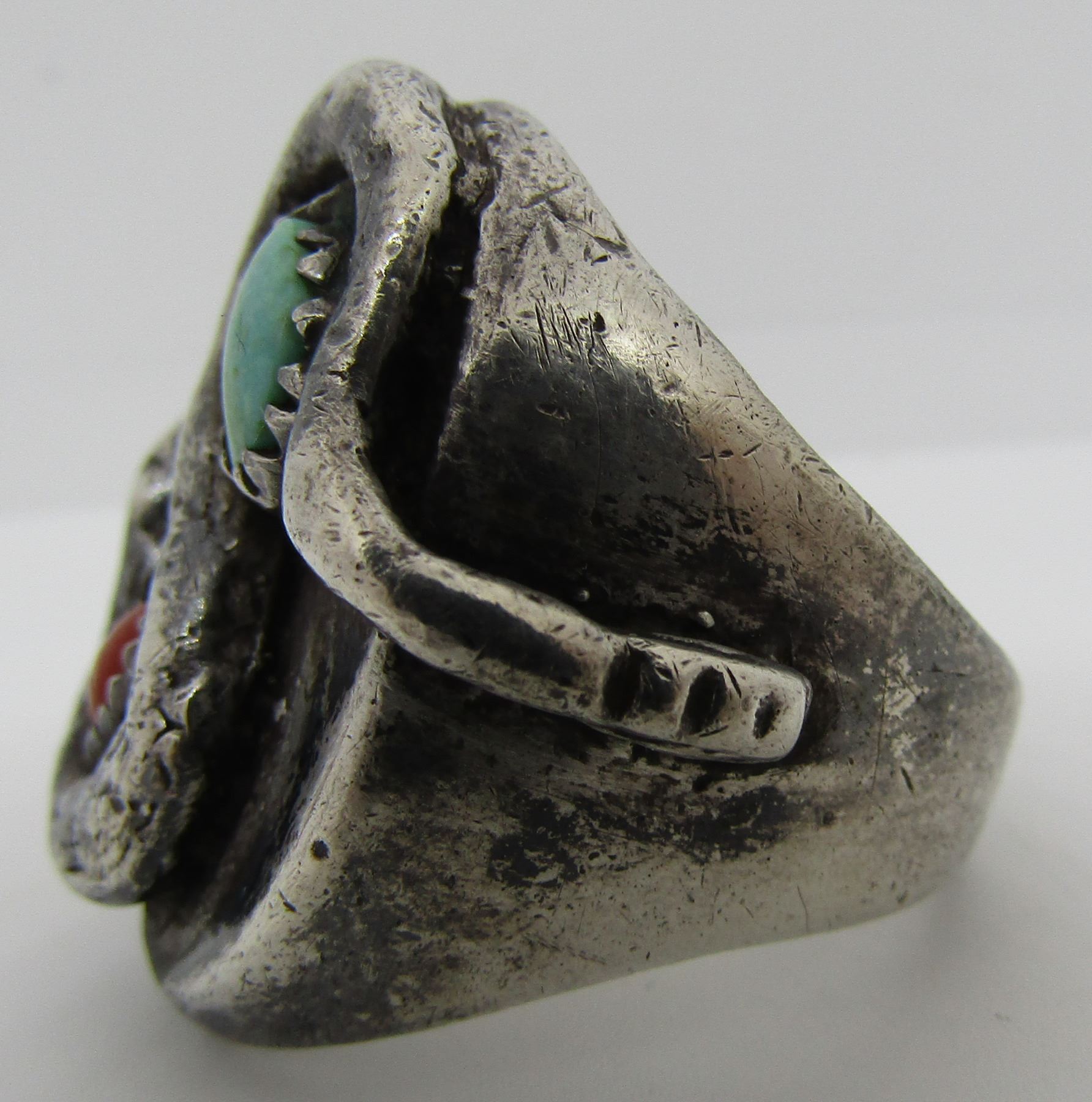 EARLY OLD PAWN HALLMARKED "Y" TESTED STERLING SILVER. VINTAGE ESTATE NATIVE AMERICAN SOUTHWEST INDIAN JEWELRY. BEZEL MOUNTED WITH 1 GREEN TURQUOISE AND RED CORAL STONES. TOP MEASURES 25MM WIDE BY 27MM LONG..WEIGHS 28.8 GRAMS. SIZE 9.25. USA SHIPPING $5.